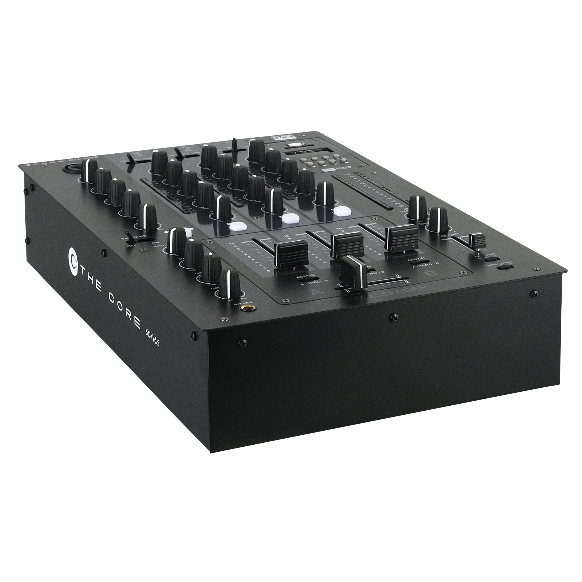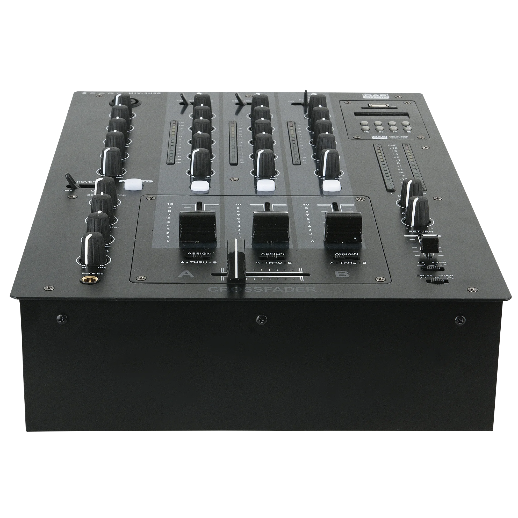 The DAP CORE MIX-3 USB is a DJ mixer with 8 analogue inputs and 2 independent USB-Audio interfaces. This makes it easy to connect your laptop and route the audio of your DJ software directly through the MIX-3 USB. It has an independent variable fx send for each channel which makes it possible to be creative with external effects. The return is controlled by a 45 mm fader. The microphone channel has a 3 band EQ, talk-over function and an on/off switch to make MC-ing save and easy for party jocks & MC’s. Low tone control on the headphone output makes it possible to adjust your favorite sound. All the pot metres are locked below the surface for extra stability and it has a separate fader print board for easy maintenance. It is equipped with unbalanced and balanced outputs with trim function and has a MP3 module which can record and playback your life performance directly on an USB or SD device.