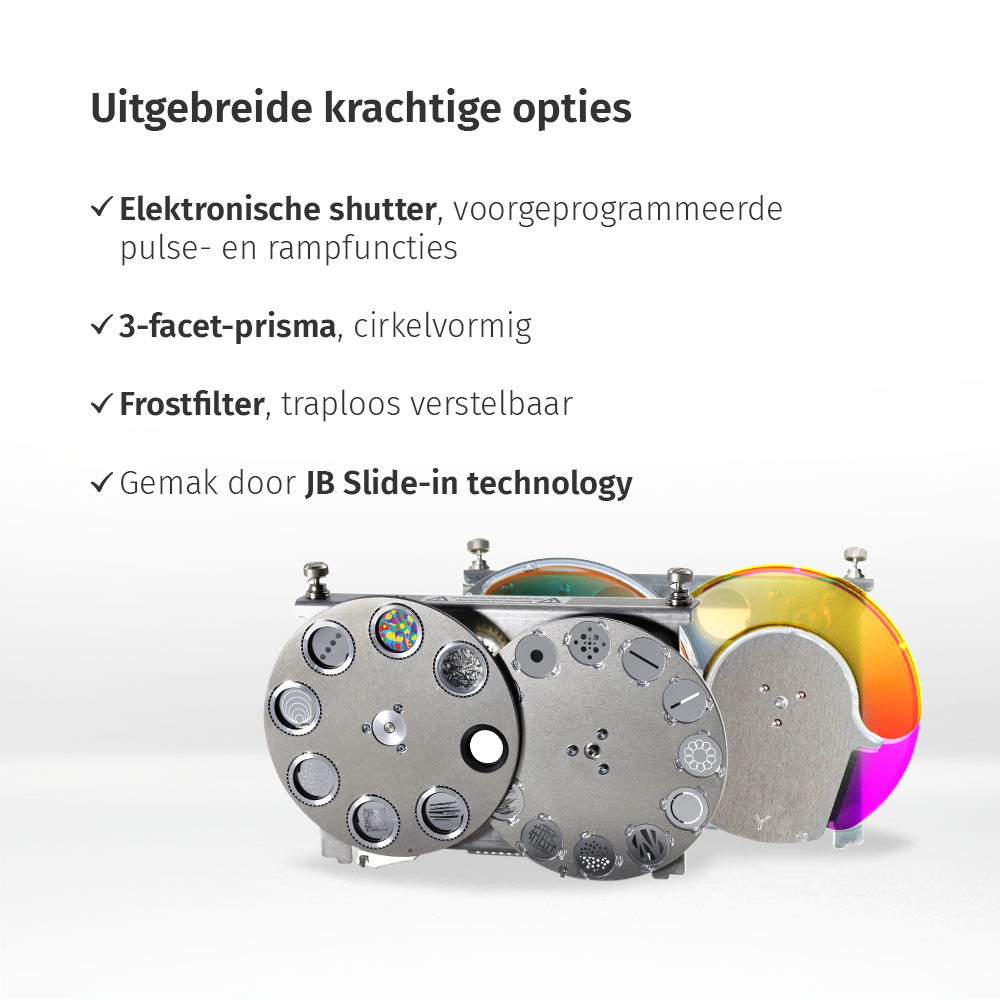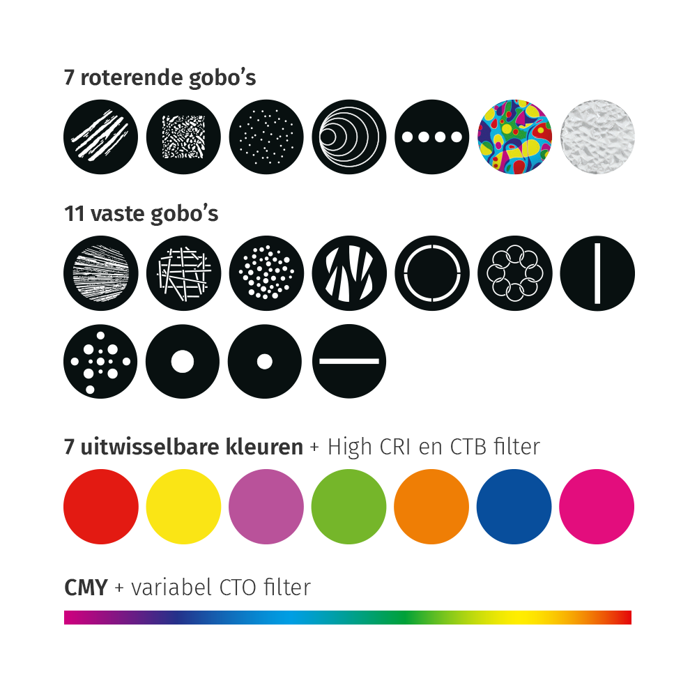 • 1 colour wheel with 7 colours, High CRI filter, CTB filter