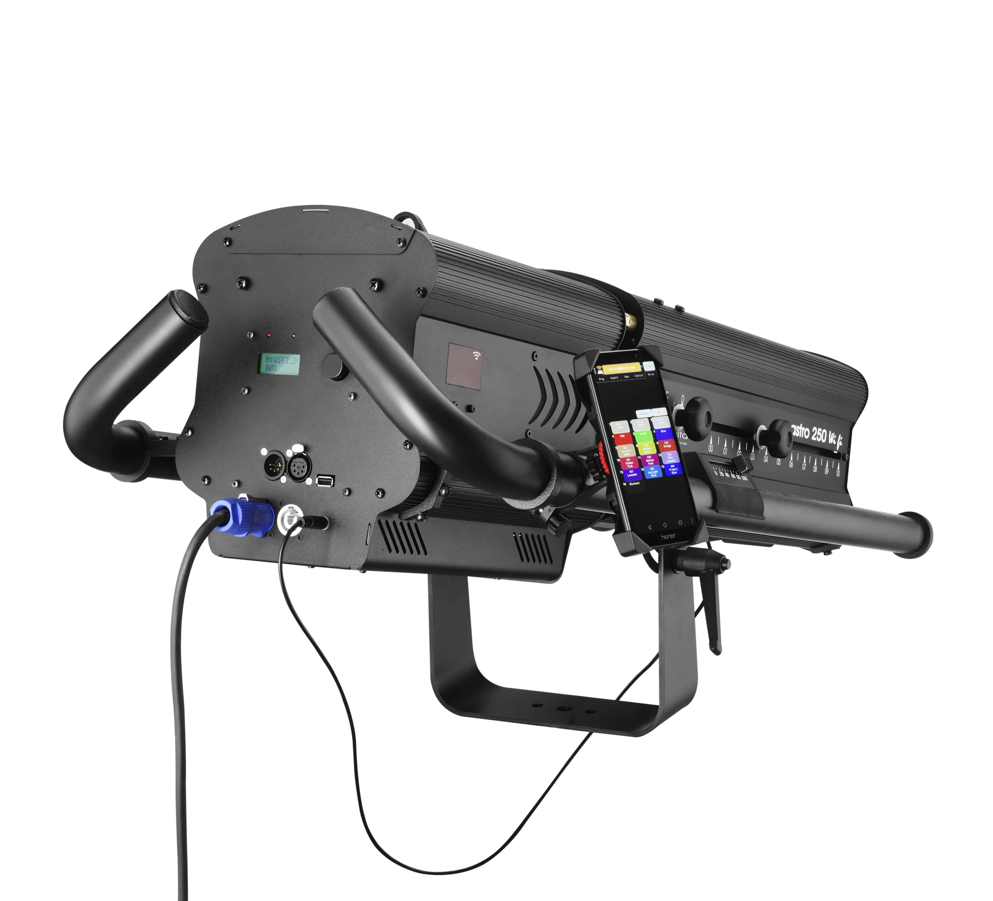 Stylish, compact and highly efficient RGBW led followspot whose unique features allow extremely precise and user-friendly control in any situation. - Colour control by Android or IOS mobile device via self-generated wi-fi own zone (1 device only, 12m range) or remotely DMX512-RDM - USB port included to charge your mobile device while operating the followspot - Clamp on universal mobile phone holder, 3.5/6.5in, 360¡ rotatable, supplied - Clamp on digital dimmer, positionable along the side bars to meet each operator's needs, supplied - Android mobile phone, with pre-loaded custom colour library, on request - Free custom colour library available to download from our website for those using their own mobile device.