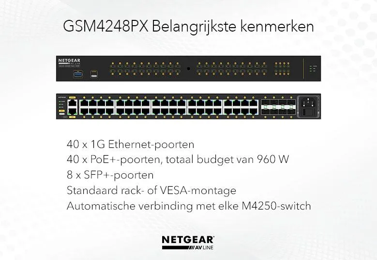 Netgear | GSM4248PX | 48-port AV network switch | 40x 1G PoE+ 960W | 8x SFP+ fibre ports | Managed Switch