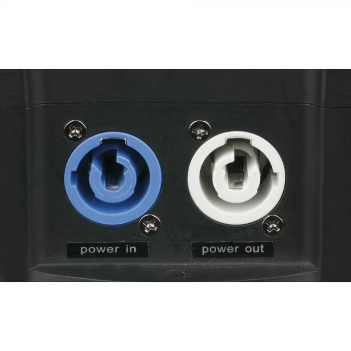The PowerBOX 3 has a blue power input with fast-lock and 2 white power outputs with fast-lock on each side, along with 3x Schuko power outputs and a built-in wireless 2.4GHz DMX receiver for distributing DMX directly to the right location.