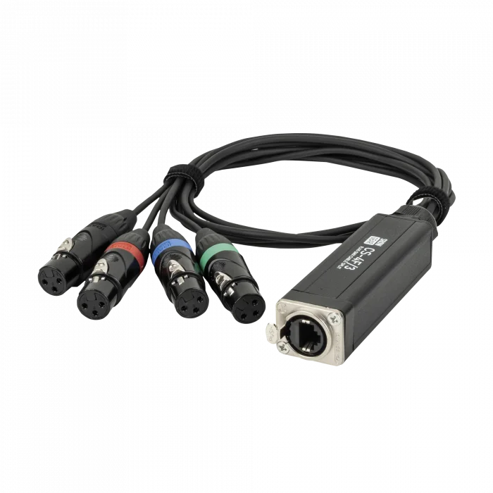 The Showgear CS-4F/3 is a 4-channel colour-coded DMX shuttle for connecting four male 3-pin DMX connectors to a male RJ45 internet data connector. It allows you to transmit data from four universes over a single CAT cable.