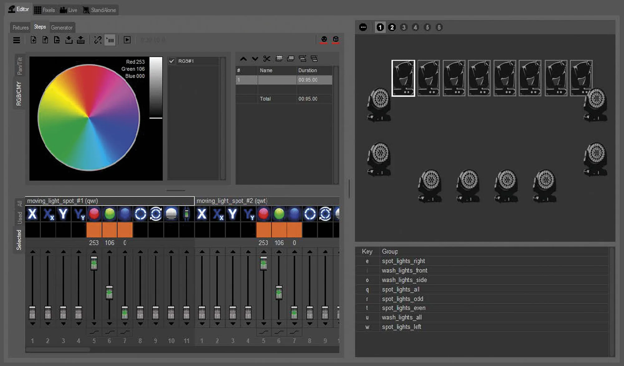 With Editor > Steps you can create scenes. The view manages many functionalities like: • DMX values per fixture • RGB color picker • Chase step overview and editor • Time and fade mode per channel • 2D fixture view • Fixtures grouping