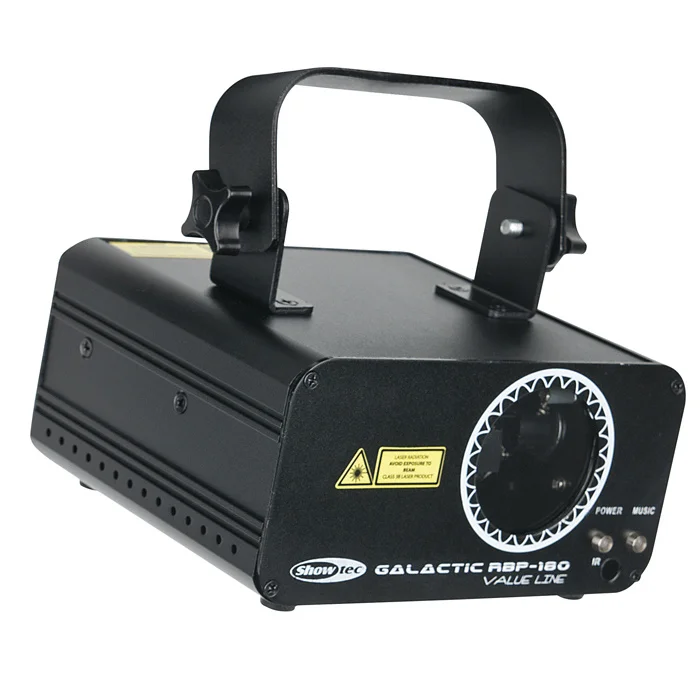 Technical specifications Laser Power: 180 mW Laser Source: Diode Laser Modulation: TTL Laser Class: 3B Laser Colour: Red / Blue / Purple Control Mode: Auto / Built-in Program / Master Slave / Remote / Sound DMX Channels: 10 Power Supply: 100-240 V AC 50-60 Hz Power Consumption: 16 W Power Connector In: IEC DMX Connector: XLR 3P In/Out Height (mm): 158 mm Width (mm): 168 mm Depth (mm): 148 mm Weight: 1.3 kg IP Rating: IP20 (indoor use only) Housing: Metal Colour: Black