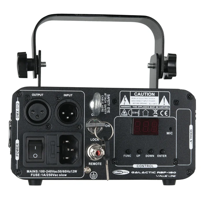The Showtec Galactic RBP-180 MKII is an 180 mW laser with Red, Blue and Purple colour output, 32 patterns and built-in programs, suitable for indoor venues. Its wide 30° scan angle with manual zoom, rotate and X/Y roll functions makes it fit for either short-throw and long distance applications. The Galactic RBP-180 MKII is controllable via DMX, Master/Slave and Infrared remote in either Manual, Auto-run and Sound controlled mode. It comes with an infrared remote and is compatible with other Galactic MKII lasers.