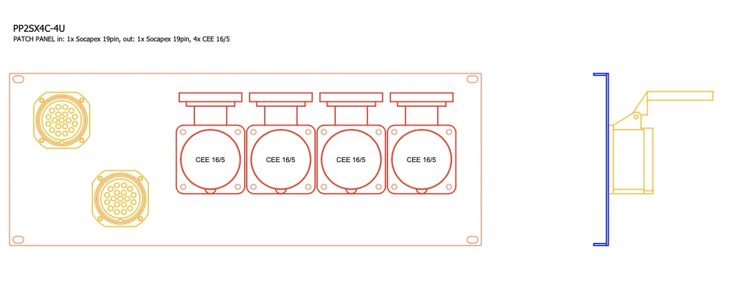 SRS Rigging | PP2SX4C | 19-inch break-out | Input: 1x Socapex | Output: 1x Socapex. 4x 16A CEE | Height: 4HE