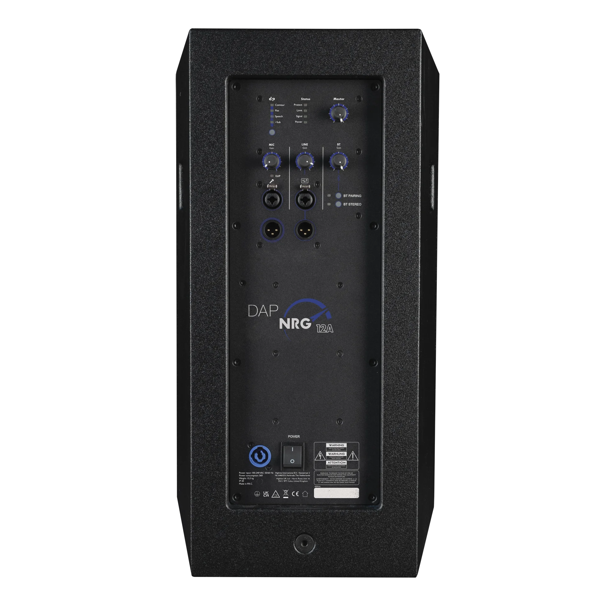 DAP NRG-12A est une enceinte active full-range d’une puissance en crête de 360 watts (180 watts RMS en continu). Elle utilise un woofer de 12 pouces et un moteur de compression de 1 pouce. Son DSP interne présente 4 modes pratiques : Contour, Flat, Speech et +Sub, qui appliquent respectivement une courbe isophone, une courbe linéaire, une courbe passe-haut ou un passe-haut à la fréquence optimisée et une courbe de phase spécifique pour la fréquence du subwoofer NRG. Le moteur de compression accompagne un pavillon rotatif à directivité de 90x60°. L’amplificateur interne de classe D comporte une alimentation en mode commuté pour l’alléger et améliorer son efficience. Le DSP interne comprend un crossover pour le woofer et le moteur de compression, un limiteur à 2 bandes, une protection contre les courts-circuits et une protection thermique.