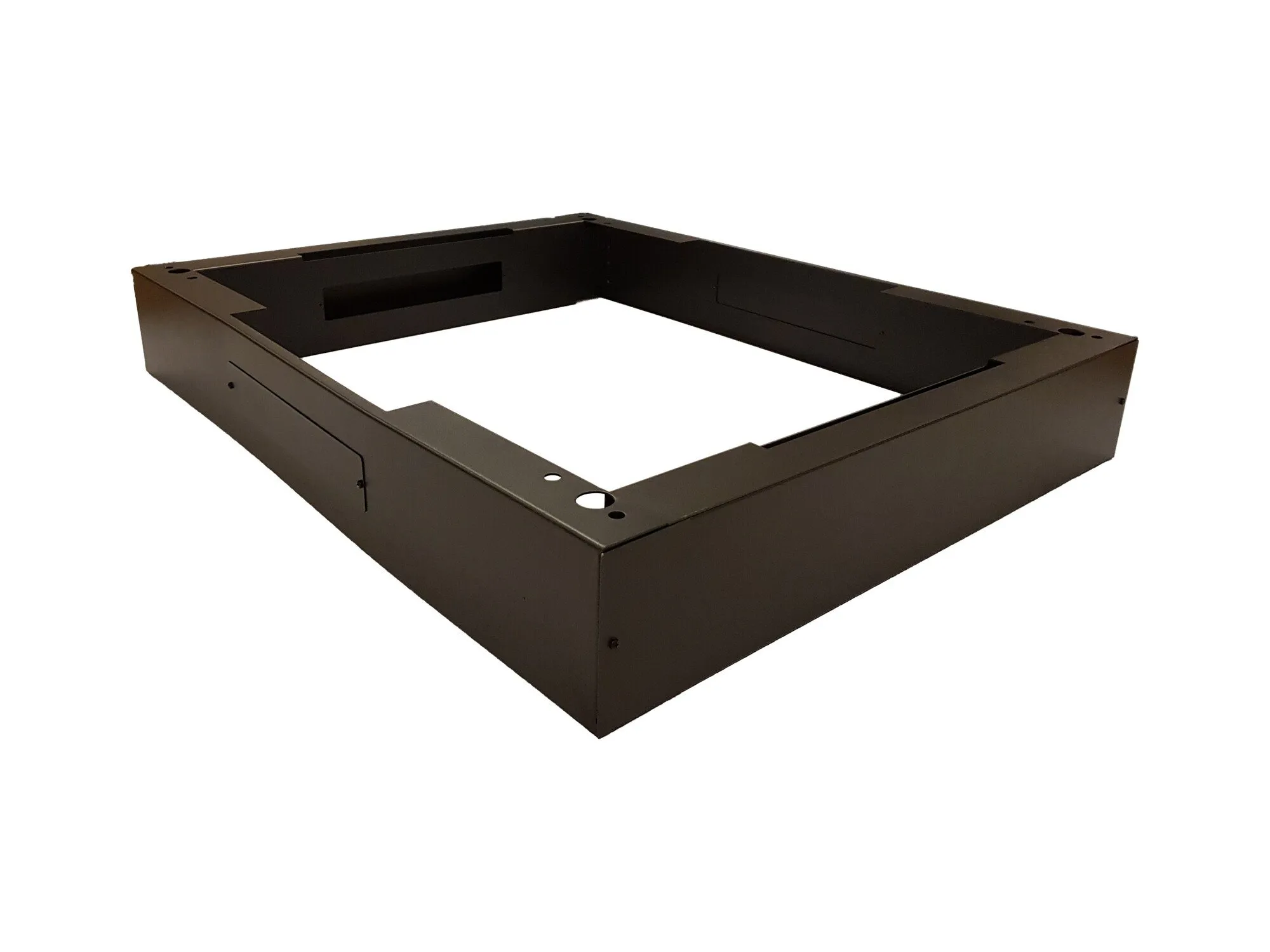 Lorsqu'une armoire pour serveurs est placée sur des roulettes ou des pieds de support, un espace ouvert est créé en bas. Pour couvrir cet espace ouvert de manière nette, il est possible de placer un piédestal qui inclut les dimensions correctes de l'armoire pour serveurs.