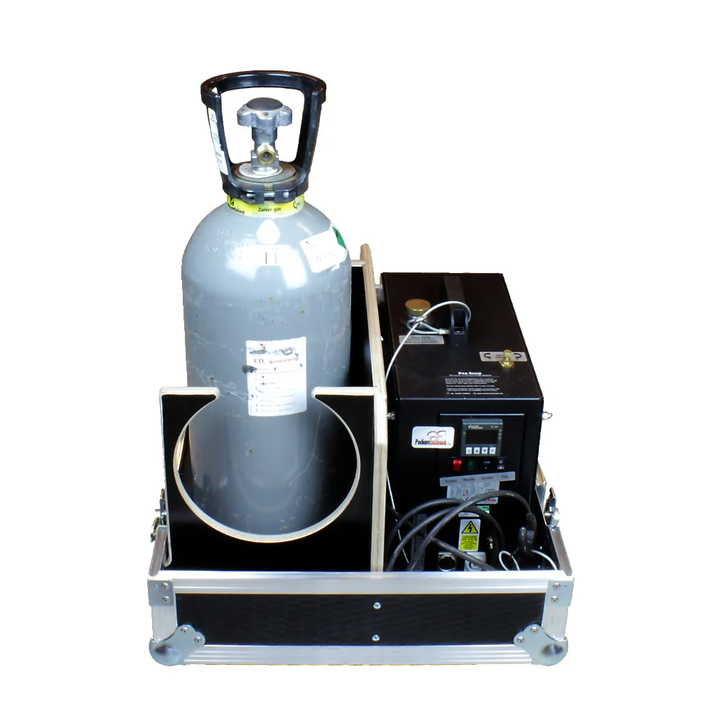 Flight case de base pour Pea Soup Phantom (version avec ventilateur PS49 et version sans ventilateur PS48) avec roues robustes et compartiments pour bouteille de CO2 (2kg), bouteille de CO2 de rechange (2kg), régulateur de pression de CO2 et 5 litres de liquide d'épandage.