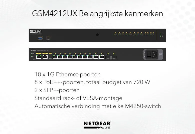 Netgear | GSM4212UX | commutateur réseau AV 12 ports | 8x 1G Ultra90 PoE++ 802.3bt 720W | 2x 1G | 2x SFP+ ports fibre | Commutateur géré