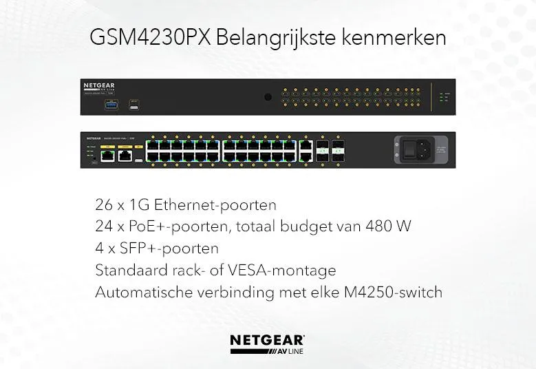 Netgear Netgear | GSM4230PX | Commutateur réseau AV 30 ports | 24x 1G PoE+ 480W | 2x 1G | 4x SFP+ ports fibre | Commutateur géré