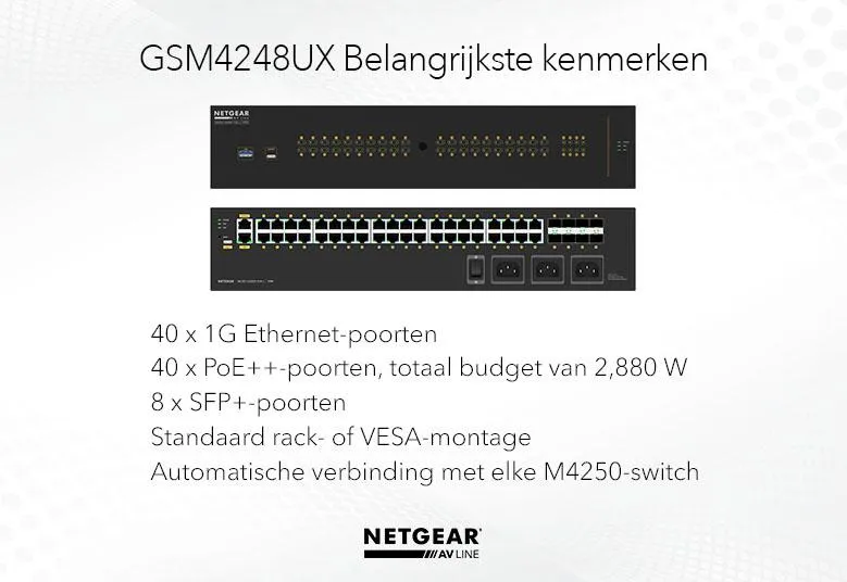 Netgear | GSM4248UX | Commutateur réseau AV 48 ports | 40x 1G PoE++ 2,880W | 8x ports fibre SFP+ | Commutateur géré