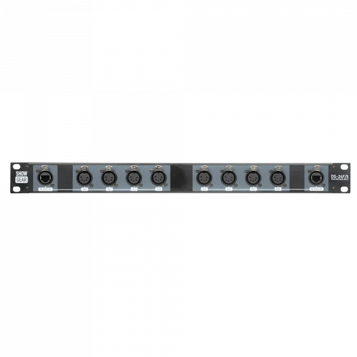 Le Showgear DS-24F/5 est une version rack 19" permettant de convertir 8 câbles DMX (univers) en 2 câbles CAT. Chaque connecteur CAT est associé à quatre connecteurs XLR femelles à 5 broches. Cela vous permet d'atteindre de plus grandes distances avec moins de câbles tout en minimisant la perte de signal.
