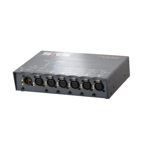 Tous les splitters DMX de SRS Lighting peuvent être équipés de DMX 3 et/ou 5 broches XLR et/ou RJ45. Tous les splitters DMX disposent d'une entrée DMX et d'une sortie DMX. Les sorties DMX sont des lignes isolées optiquement/électriquement et sont marquées par des numéros. Chaque sortie DMX dispose d'une alimentation et d'un pilote de ligne séparés, et d'une indication claire du signal au moyen de deux diodes électroluminescentes par sortie. Les splitters DMX sont équipés d'une alimentation à découpage, permettant à la tension secteur de varier entre 85V et 265V. Les splitters SRS sont disponibles avec une connexion DMX XLR à 3 ou 5 pôles. Les spécifications :