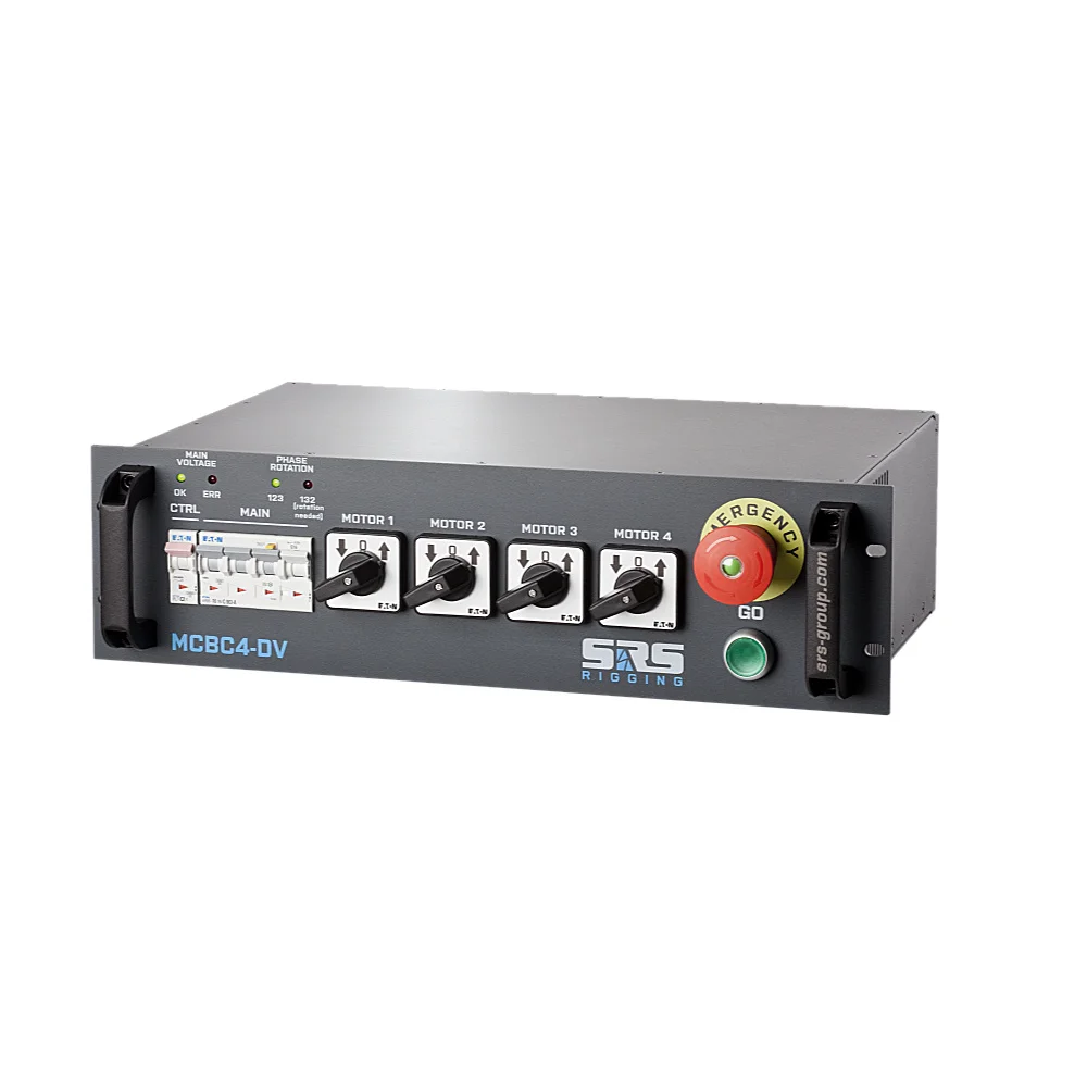 SRS Rigging | MCBC4-DV-CEE | Commande de palan à 4 canaux | Type de commande : Tension directe | Entrée : CEE32A-5p | Sortie : 4x CEE16A-4p