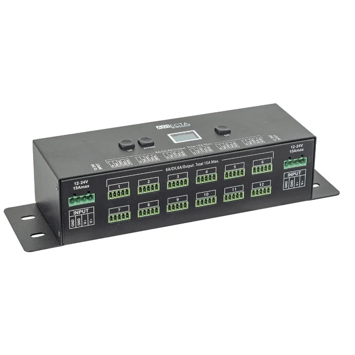 De LED Dim 12 dimmer is een universele en veelzijdige PWM dimmer die geschikt is voor gebruik met LED-strips met constante spanning. Hij heeft 12 uitgangen die allemaal 4-kanaals strips met een werkspanning van 12V tot 24V kunnen aansturen. Instellingen kunnen eenvoudig worden gedaan door het OLED-display. DMX aansluitingen kunnen worden gedaan met RJ45 of 3-polige DMX stekkers. Zowel de voeding als de aansluitingen van de LEDs zijn gebruiksvriendelijk door middel van (eenvoudig te verwijderen) Phoenix klemaansluitingen.