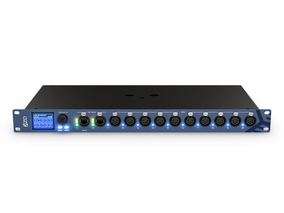 GeNetix Node 10 is een multifunctionele node die een oplossing biedt voor gegevensdistributie op afstand in een groot aantal toepassingen, en met name ondersteuning biedt voor Timecode, MIDI en 10Scene.