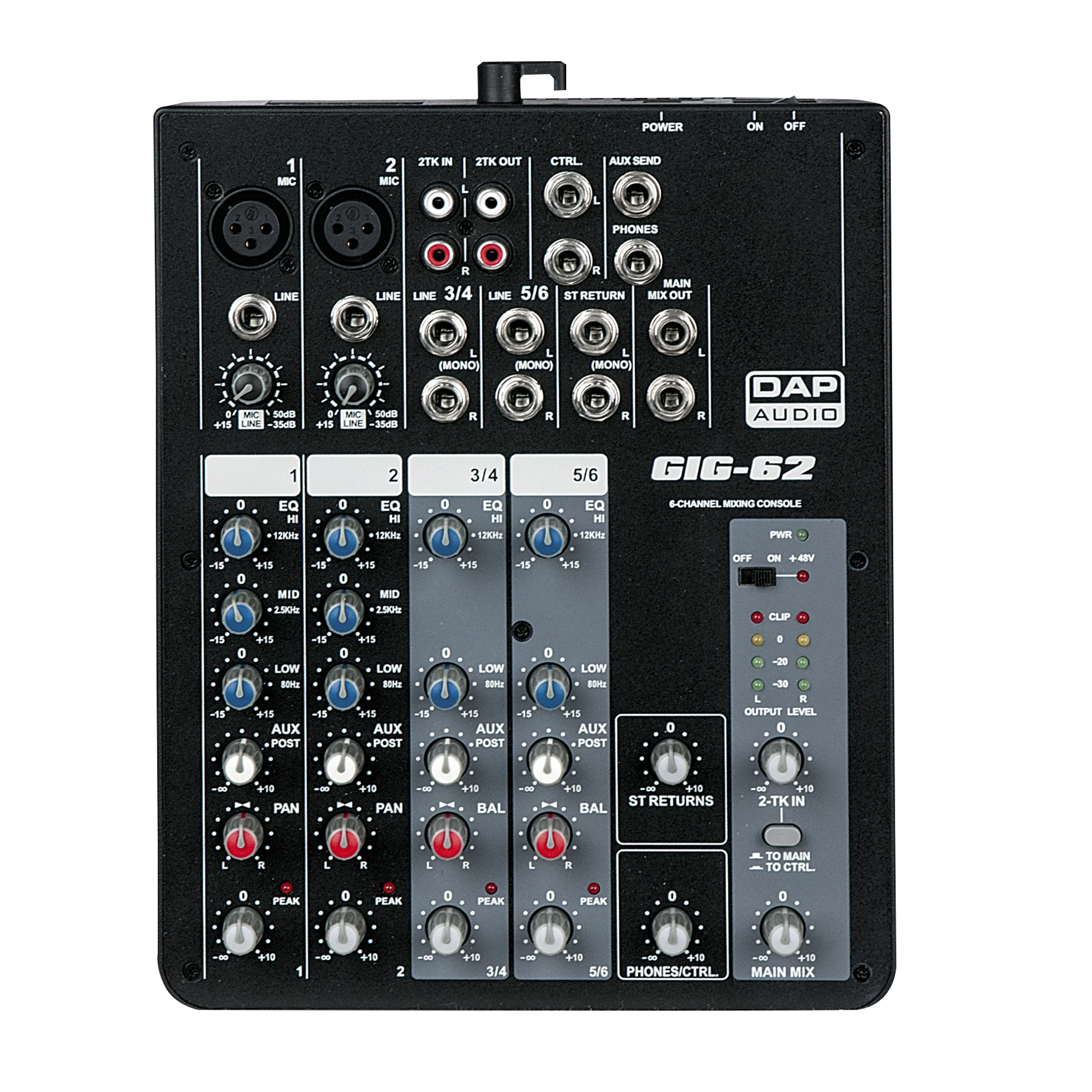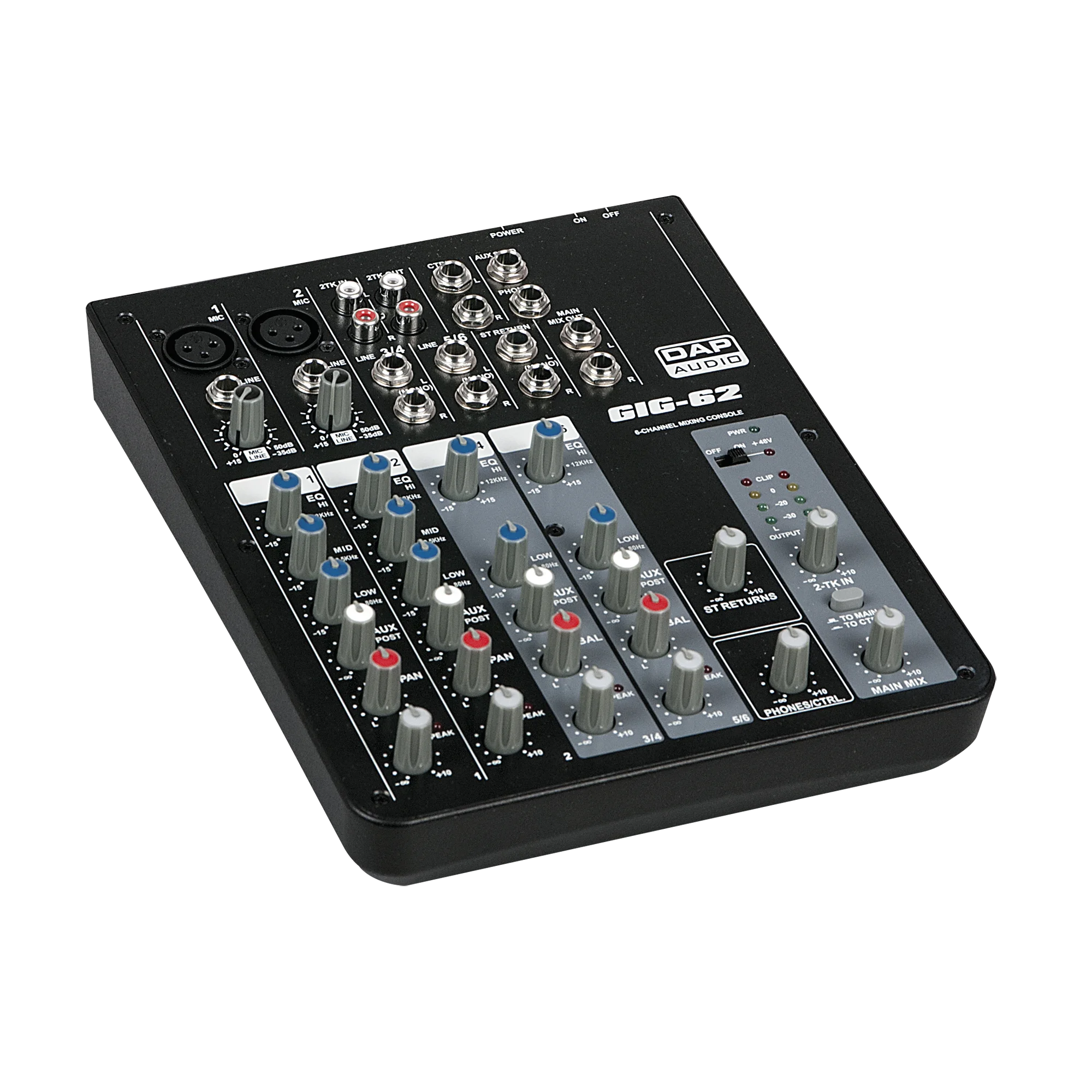 De DAP GIG-62 is een 6-kanaals analoog mengpaneel met 2 stereo en 2 mono ingangen, uitgerust met +48 V fantoomspanning waarmee zowel dynamische als condensator microfoons kunnen worden gebruikt. De mono kanalen zijn uitgerust met 3-band EQ en de stereo kanalen met 2-band EQ. Het is daarnaast mogelijk om een extern effect per kanaal toe te voegen dankzij de AUX uitgangen. Deze compacte en lage-ruis mixer is hierdoor erg practisch voor kleine optredens, conferentieruimten en opnamestudio's voor thuis.