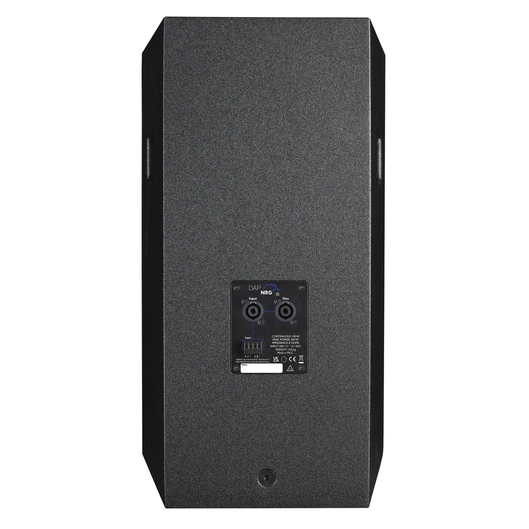 De stevige, lichtgewicht multiplex kast heeft een dubbele speakerflens (0° en 5°), zodat je de kast naar beneden kunt richten bij opstelling op een paal. Hij is voorzien van 4-polige speaker in en thru connectors en beschikt over een extra 4-polige terminal connector, die vooral handig is voor permanente installatietoepassingen. Om het beste uit de NRG-12 te halen, raden we aan een 4e orde hoogdoorlaatfilter op 50 Hertz te gebruiken en er een subwoofer uit de NRG-serie bij te gebruiken.