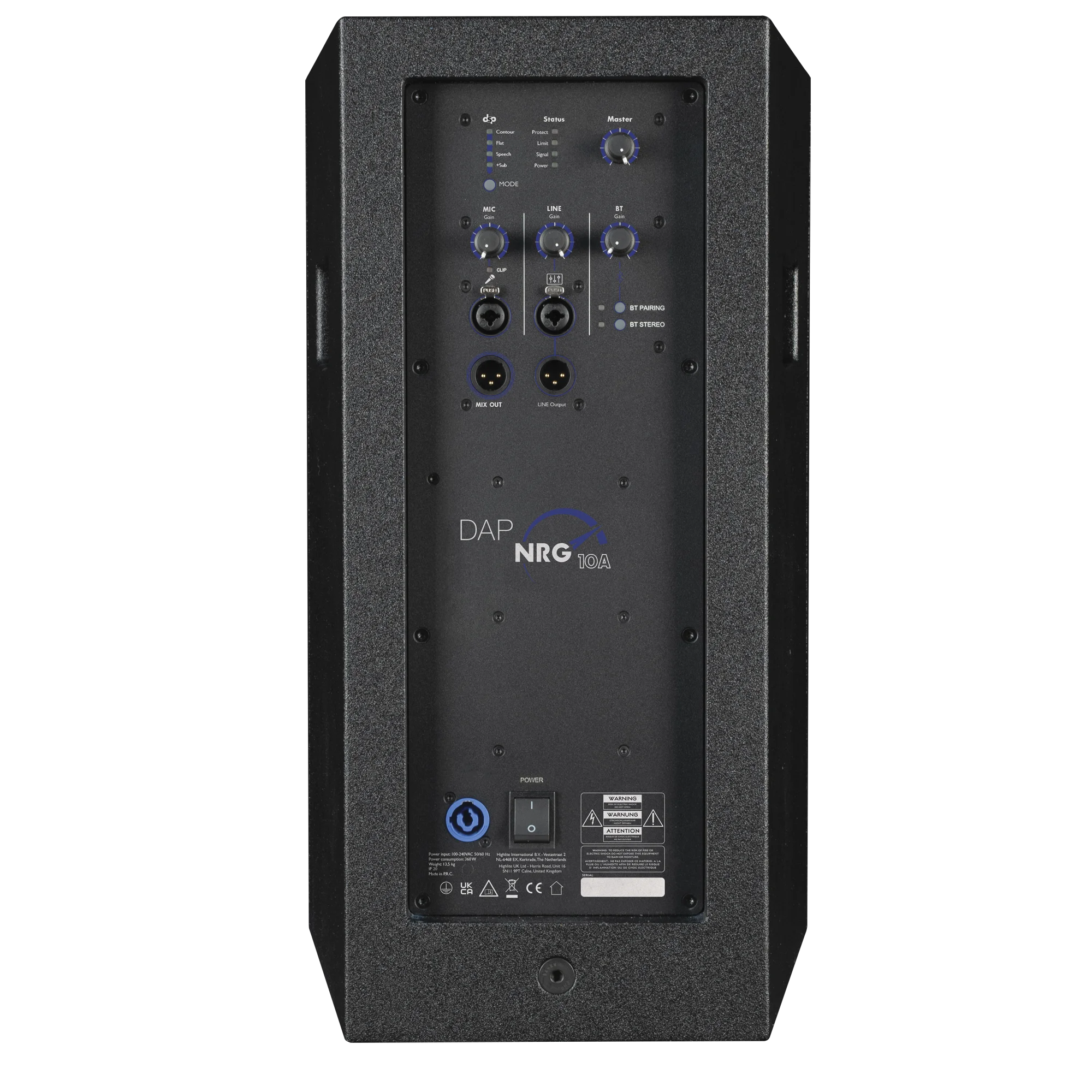 De DAP NRG-10A is een actieve full-range luidspreker met een piekvermogen van 360 watt (180 watt continu RMS). Hij heeft een 10" woofer en een 1" compressiedriver, en beschikt over een interne DSP met 4 handige modi: Contour, Flat, Speech en +Sub, die respectievelijk een loudness-curve, een vlakke curve, een high-pass-curve of een high-pass met geoptimaliseerde frequentie- en fasekarakteristiek specifiek voor de NRG-subwooferreeks toepassen. De compressiedriver is gekoppeld aan een draaibare hoorn met een richtingsgevoeligheid van 90°x 60°. De interne klasse D-versterker heeft een schakelende voeding om het gewicht laag en de efficiëntie hoog te houden. De interne DSP bevat een crossover voor de woofer en de compressiedriver, een 2-bands limiter, een kortsluitbeveiliging en een thermische beveiliging.