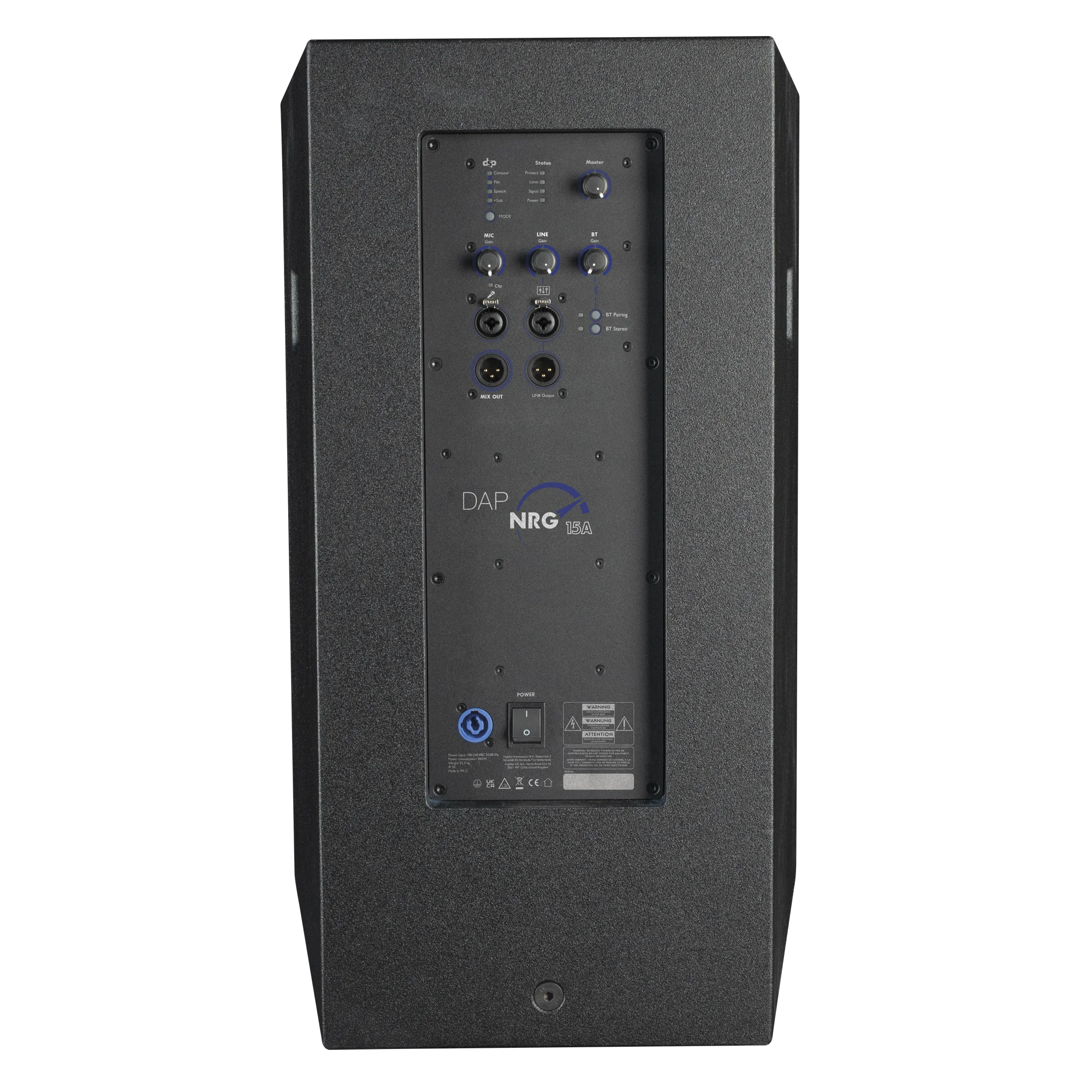 De DAP NRG-15A is een actieve full-range luidspreker met een piekvermogen van 360 watt (180 watt continu RMS). Hij heeft een 15" woofer en een 1" compressiedriver, en beschikt over een interne DSP met 4 handige modi: Contour, Flat, Speech en +Sub, die respectievelijk een loudness-curve, een vlakke curve, een high-pass-curve of een high-pass met geoptimaliseerde frequentie- en fasekarakteristiek specifiek voor de NRG-subwooferreeks toepassen. De compressiedriver is gekoppeld aan een draaibare hoorn met een richtingsgevoeligheid van 90°x 60°. De interne klasse D-versterker heeft een schakelende voeding om het gewicht laag en de efficiëntie hoog te houden. De interne DSP bevat een crossover voor de woofer en de compressiedriver, een 2-bands limiter, een kortsluitbeveiliging en een thermische beveiliging.
