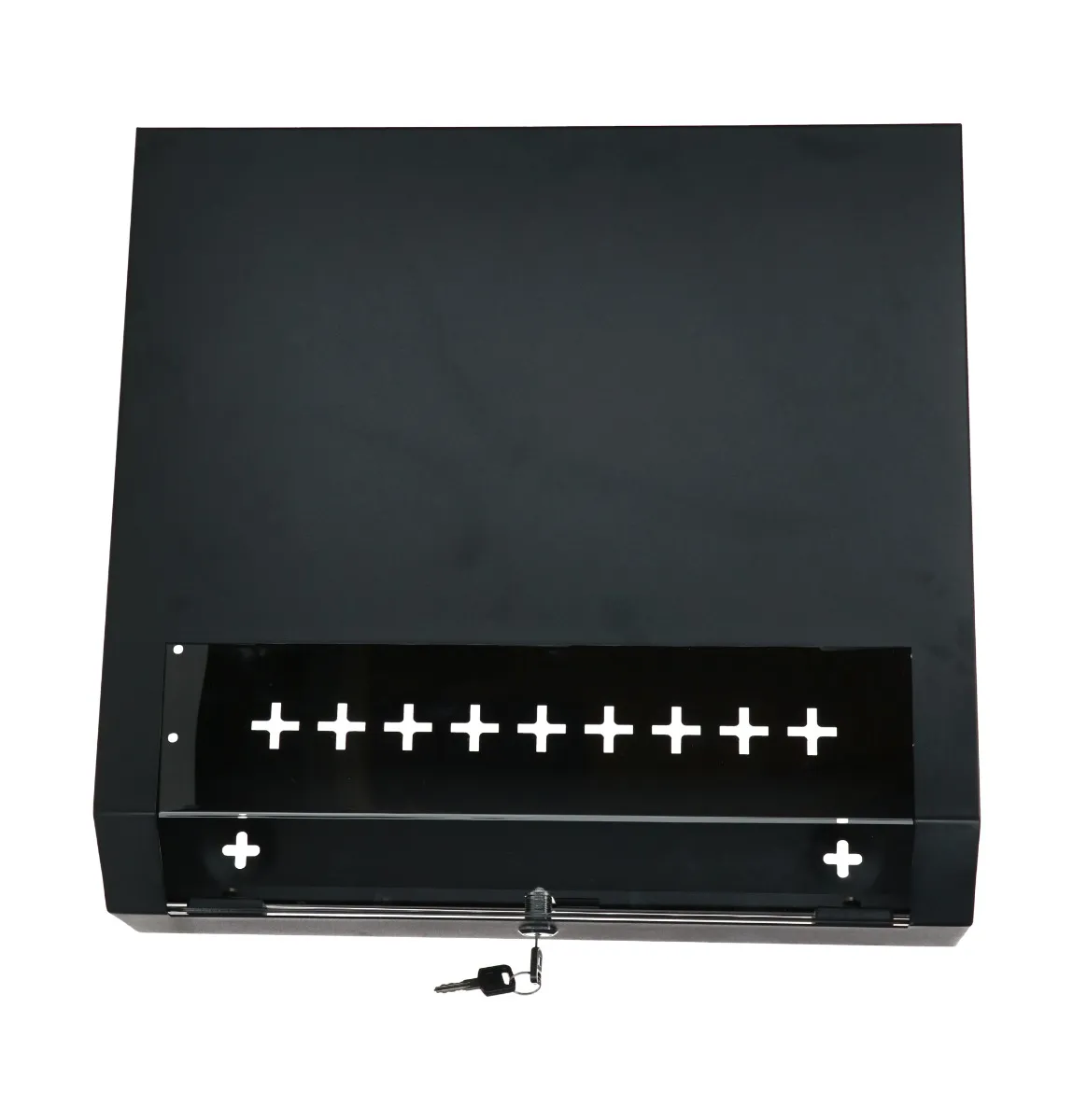Deze vlakke 19 inch wandkast bied ruimte voor een complete netwerkinstallatie. Je plaatst netwerkapparaten – zoals een patchpanel of ethernet switch verticaal in de kast. Door de kabeldoorvoer links en rechts leg je stroom- en netwerkkabels netjes in en uit de kast. De kast heeft een handig scharnier waardoor de klep open kan blijven staan. Dit maakt de installatie en het onderhoud een stuk makkelijker.