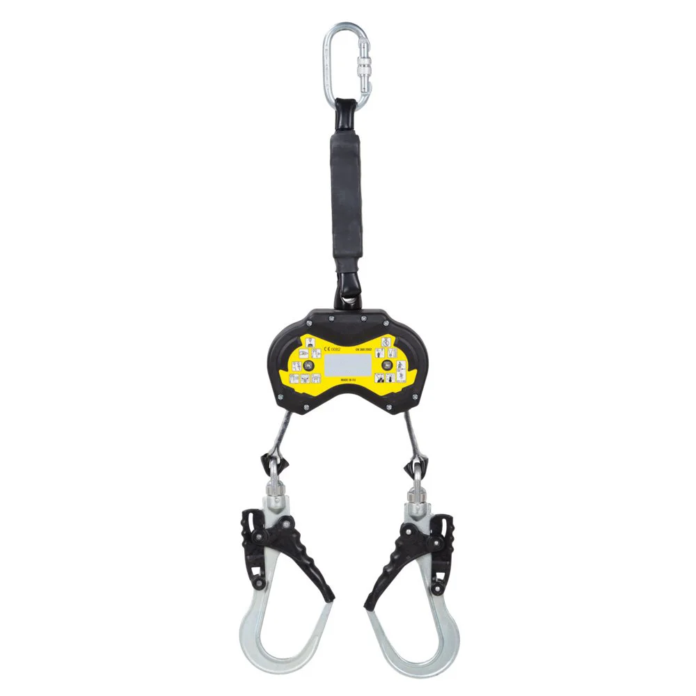 ELLERsafe dubbel valstopapparaat DWR040S:- Gebruiker mag boven het ankerpunt werken; - Maximale fall factor van 2; - 2x Steigerpijphaak - 1x karabijnhaak; - Bandmateriaal; - Ingebouwde valdemper; - Behuizing: kunststof; - Materiaal: roestvrij staal; - Gewicht: 2,3kg; - Lengte: 2m; - Max. 140kg; - EN 360