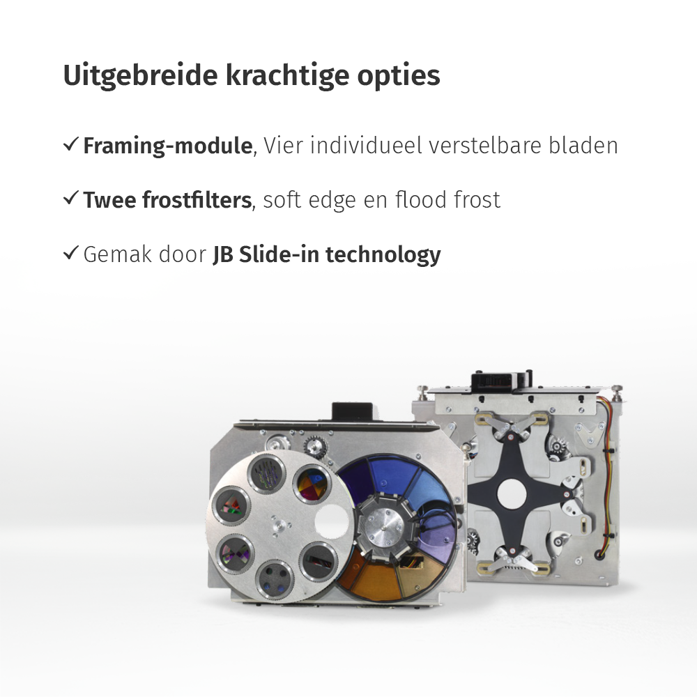 | Dichroide kleurenwiel | Kleurenwiel 1: 6 kleuren + High CRI filter (HP) / 7 kleuren | Kleurenwiel 2: 7 Correctiefilters (CTB/CTO) |