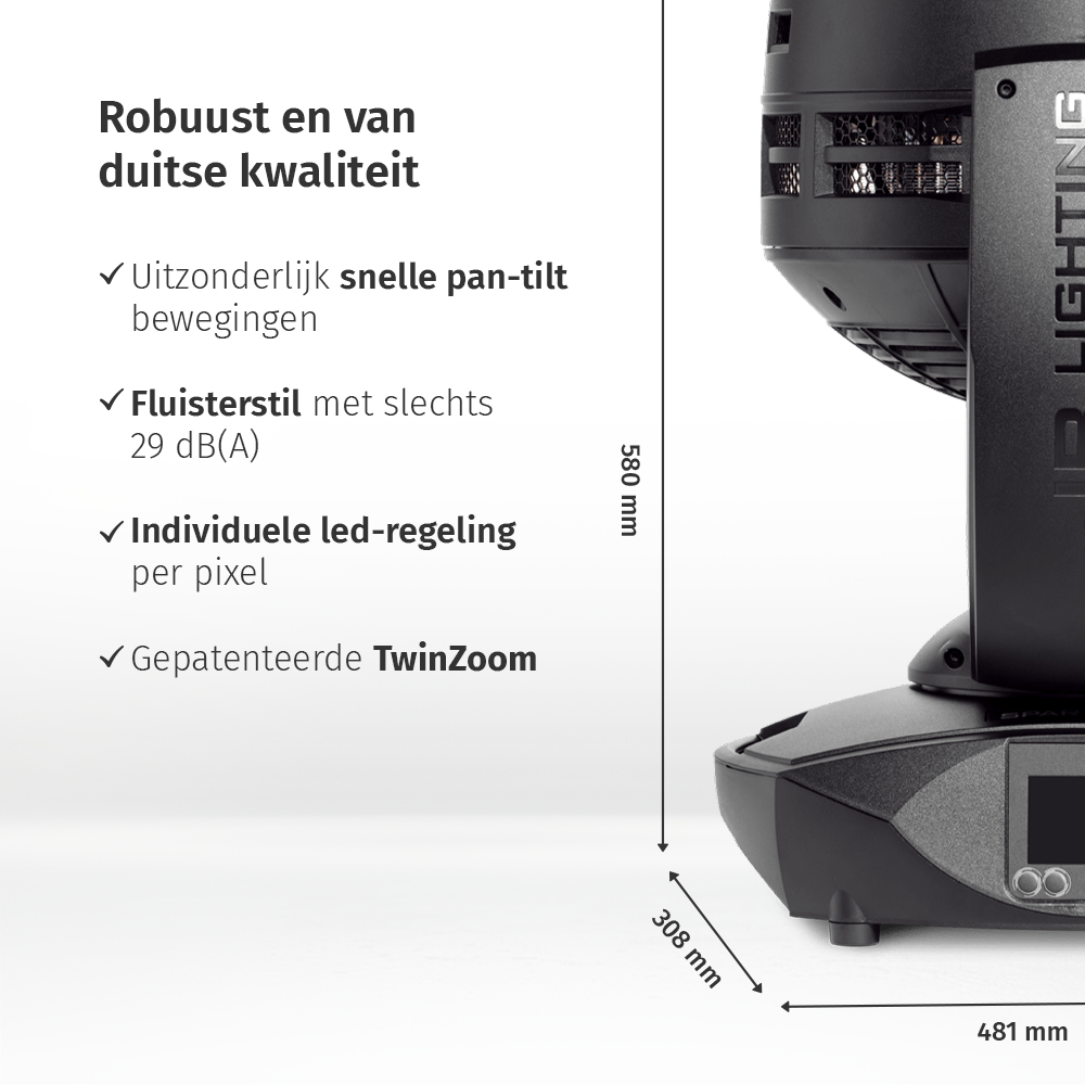 De lichtsterkte en het zoombereik van 3° - 70° van de Sparx 18 zijn indrukwekkend. De Sparx 18 is vrijwel geruisloos, absoluut nauwkeurig en snel, en verandert van een extreem smalle naar een brede bundel. Wanneer je de TwinZoom wordt gebruikt, kun je zeker zijn van de wow-factor.