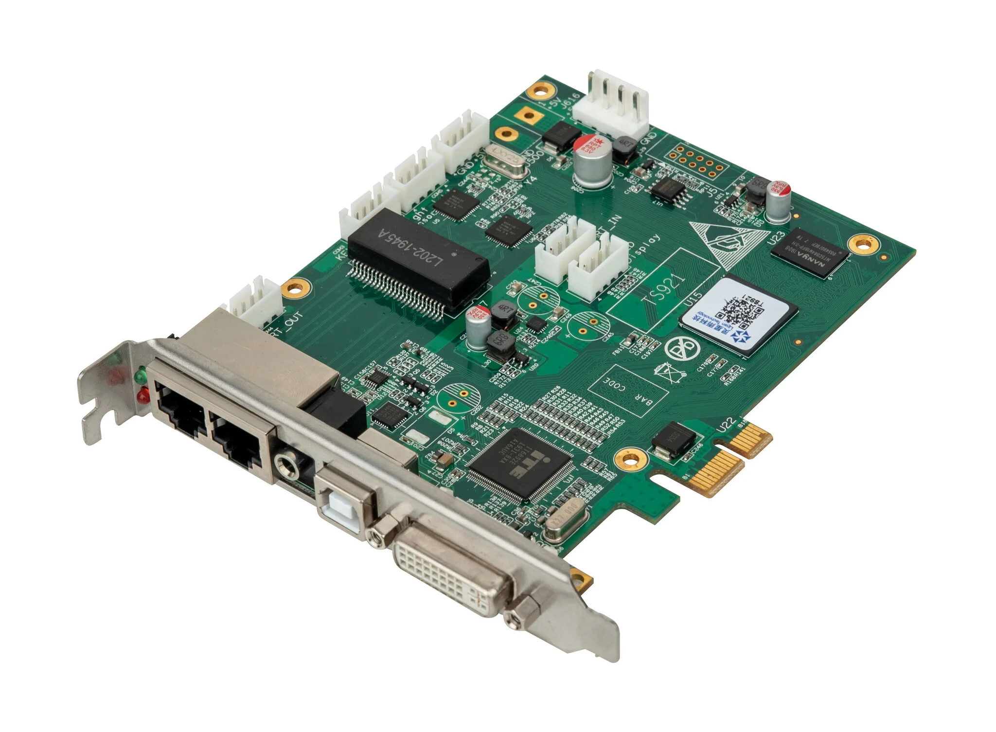 De LINSN TS921 is een LED zenderkaart zonder schaalfunctie voor het besturen van LED schermen tot 1,300,000 pixels. Hij ondersteunt een videoingangbron tot 1920x1200p @60 hz en is uitgerust met twee ethernet poorten voor het besturen van 650,000 pixels per uitgang. Hij kan direct worden ingebouwd in een computer door zijn PCI Express slot te gebruiken, maar kan ook worden gebruikt als standalone apparaat. Hij is eenvoudig te configureren via USB door middel van software (LEDStudio V9.0 of hoger).