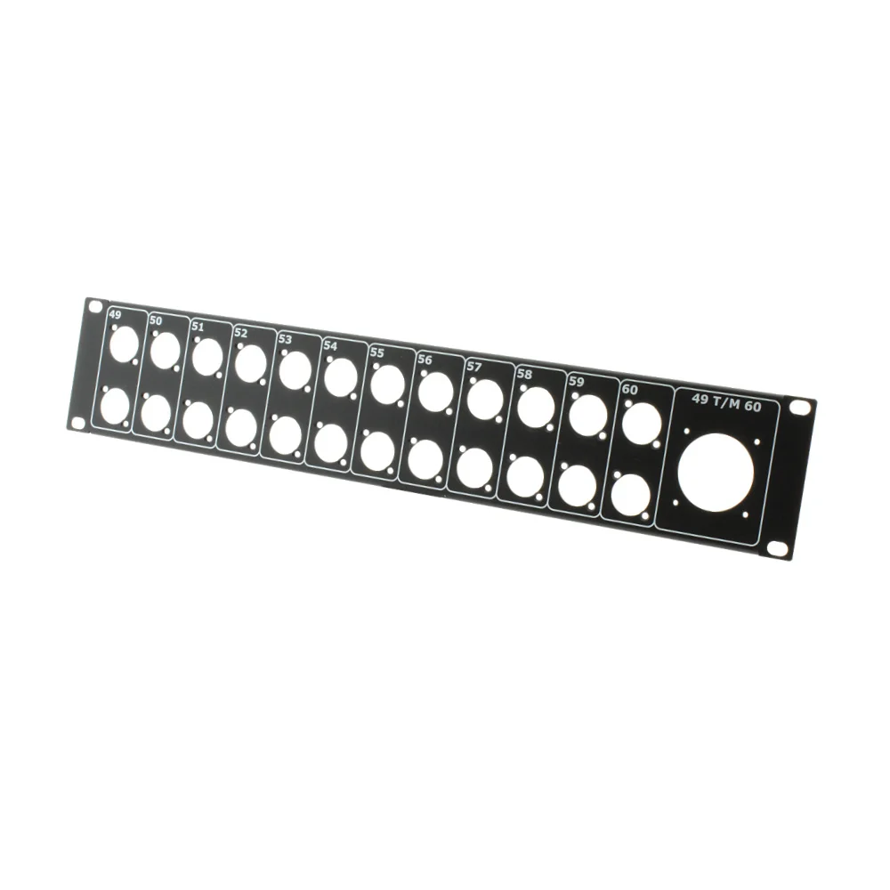 19-inch paneel voor 24x XLR-connectors (= 6x PCB met XLR, male of female) + een TEN47 of Socapex 37p-multiconnector. Nummering naar keuze 1-12, 13-24, 25-36, 37-48 of 49-60. Opdruk kan ook op aanvraag naar eigen wens worden uitgevoerd.