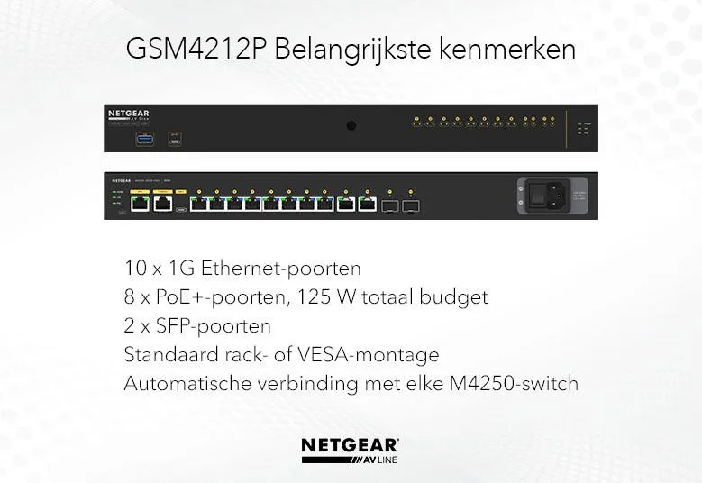 Netgear | GSM4212P | 12-poorts AV-netwerk switch | 8x 1G PoE+ 125W | 2x 1G | 2x SFP glasvezel porten | Managed Switch