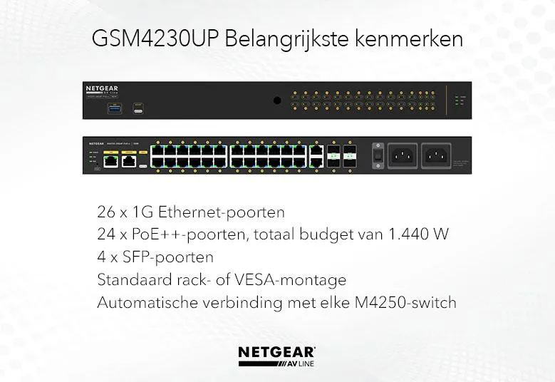 Netgear | GSM4230UP | 30-poorts AV-netwerk switch | 24x 1G PoE++ 1,440W | 2x 1G | 4x SFP glasvezel porten | Managed Switch