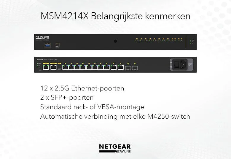Netgear | MSM4214X | 14-poorts AV-netwerk switch | 12x 2,5G | 2x SFP+ glasvezel porten | Managed Switch