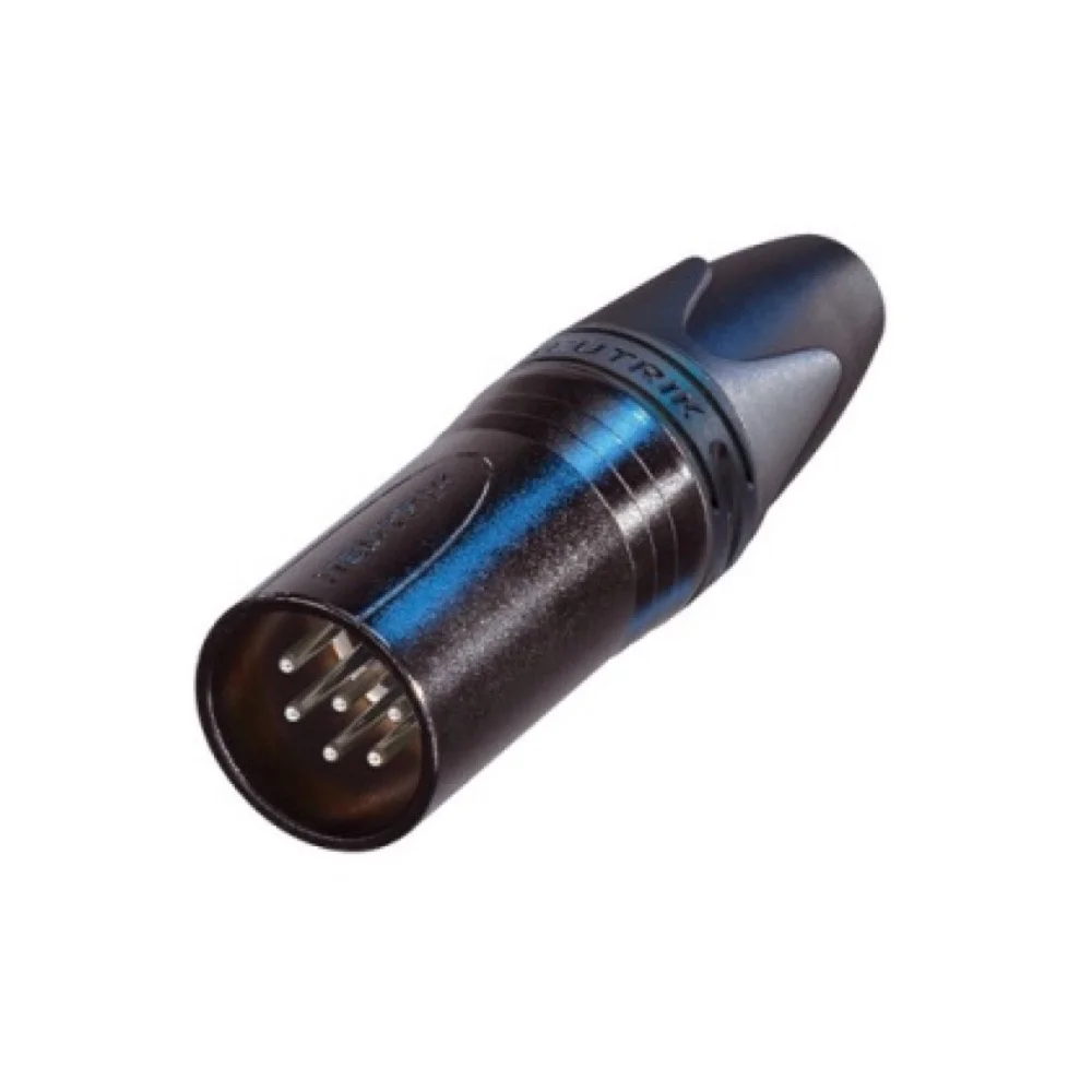 De Neutrik NC6MXX-BAG is een 6-polige mannelijke XLR-kabelconnector met een zwarte metalen behuizing en zilveren contacten.