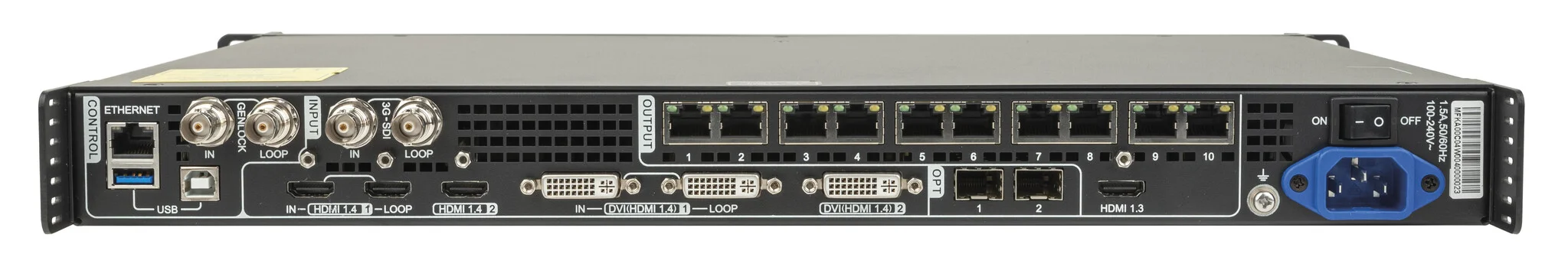 Technische specificaties HDMI 1.4a: 2 DVI dual link: 2 3G-SDI: 1 Main uitgangen: 10 HDMI 1.3 (MVR): 1 HDMI1.4a (doorlus): 1 DVI dual link (doorlus): 1 3G-SDI (loop): 1 SFP Slot Type : 10G Aantal SFP slot's: 2 Scaling functie: Yes Image Mosaic: Yes PIP: Yes Layers: 3 GenLock: In & Out Maximale belastingscapaciteit : 6.5 Mpx Maximale ingangsresolutie: 3840 x 1080 / Width and Height can be defined by users Besturings mode: Ethernet / USB Ingangssvoltage: 100-240 V AC 50-60 Hz Vermogensverbruik: 28 W Power connector in: IEC Data connector in: RJ45 / USB Data connector uit: RJ45 / USB