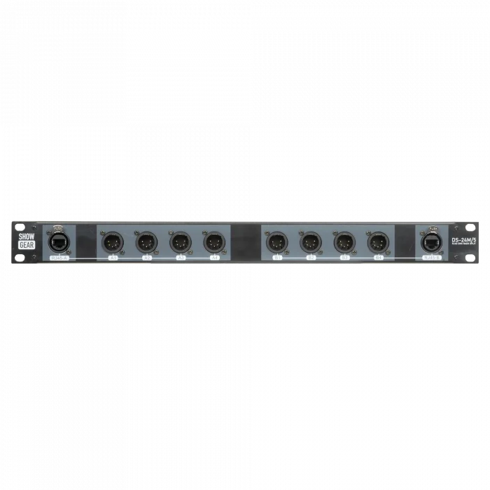 De Showgear DS-24M/5 is een 19" rackversie voor het converteren van 8 DMX kabels (universes) naar 2 CAT kabels. Elke CAT-connector is gekoppeld aan vier male 5-pin XLR connectoren. Dit helpt je om met minder kabels een grotere afstand te kunnen bereiken terwijl het signaalverlies wordt geminimaliseerd.
