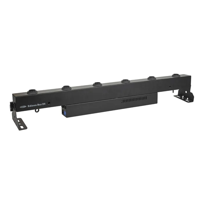 De Showtec Edison Bar E6 is een DMX LED dimmer met 6 x E27 fitting voor 6 LED lampen tot 8 watt, geschikt voor binnenlocaties. Zijn output is handmatig en via DMX bestuurbaar in zowel handmatige, automatische en geluidsgestuurde modus met diverse ingebouwde programma's. De Edison Bar E6 wordt geleverd met een montagebeugel voor snelle rigging op het podium. Een passende verlengkabel en diverse lampen zijn optioneel.