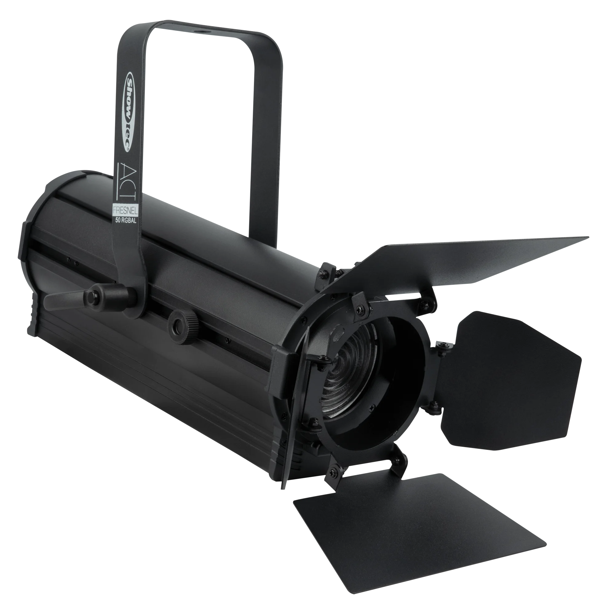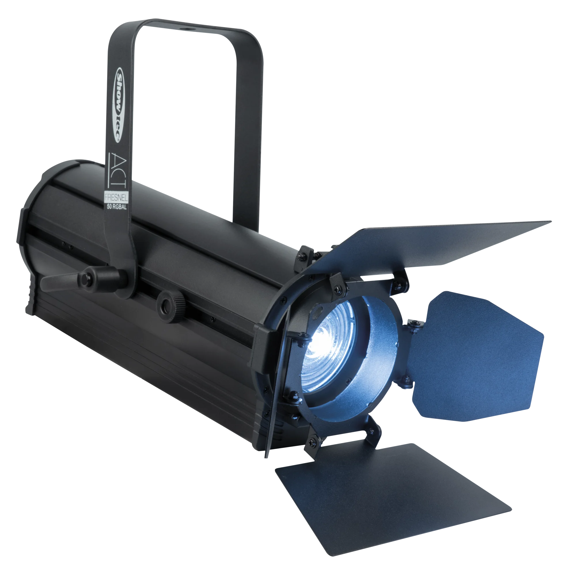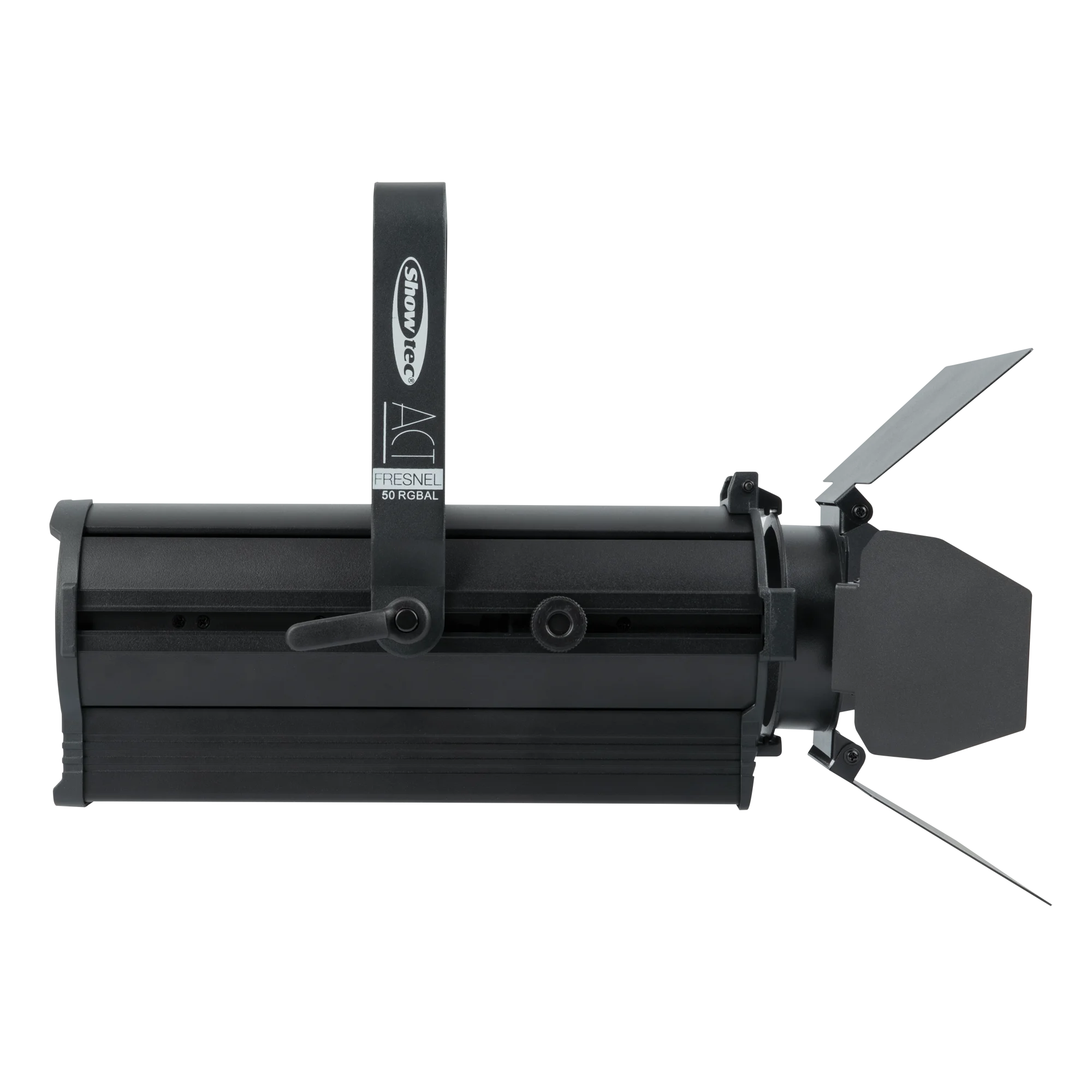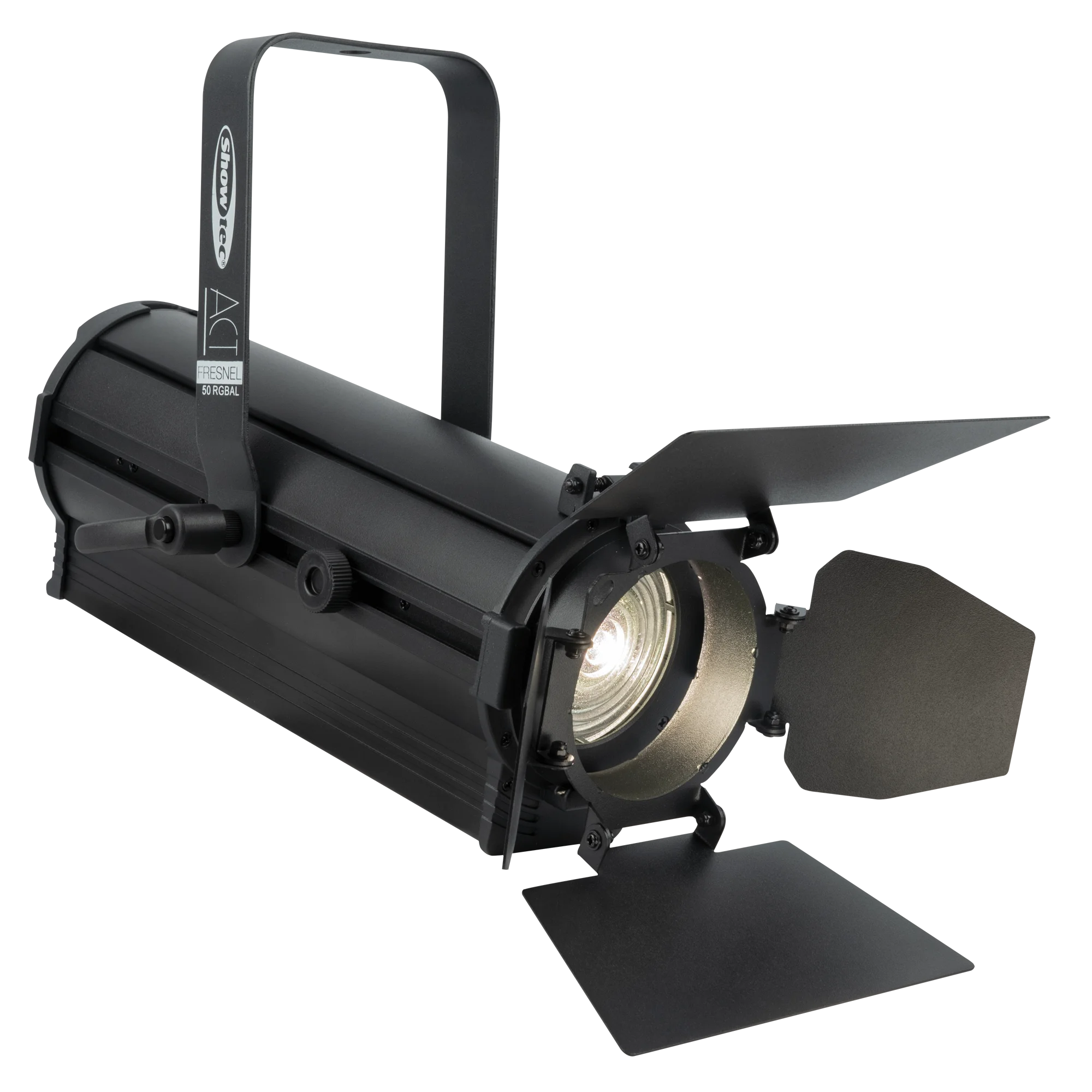 De Showtec ACT Fresnel 50 RGBAL is een compacte 50-watt RGBAL COB LED-spot met een hoge CRI (>93) en stille werking, geschikt voor theatertoepassingen, musea en tentoonstellingen. Hij gebruikt een RGBAL-lichtbron van 150 W om de kleuruitvoer te optimaliseren, zodat hij een breed kleurengamma kan creëren met behoud van een hoge CRI. Hij projecteert een heldere, zachte lichtbundel binnen een breed, handmatig instelbaar zoombereik van 15°-35°. De ACT Fresnel 50 RGBAL kan worden bestuurd via DMX, RDM en is uitgerust met een knop voor handmatige kleur- en dimmerregeling. Hij wordt geleverd met een barndoor en filterframe, zodat je de output zelf vorm kunt geven.