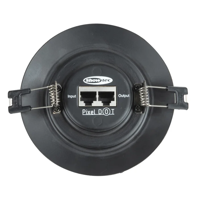 De Showtec PixelDot is een in serie schakelbare RGB LED Dot met zwarte behuizing en een mat witte 50 mm cover, geschikt voor kleurmenging bij vaste installaties. Aangestuurd door de speciale Pixelcontroller, kan de PixelDot gemakkelijk in serie worden geschakeld op elke gewenste manier met behulp van een enkele Cat-kabel tot 40 eenheden per PixelController uitgang en tot 160 Pixeldots per Pixelcontroller. Uitgerust met veerklemmen, is de installatie van de PixelDots net zo eenvoudig als gewone inbouwspots. Een RJ45-kabel van 50 cm wordt meegeleverd.