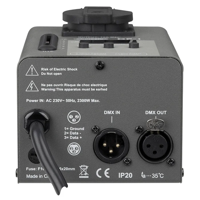 Technische specificaties Control mode: DMX / Manual DMX kanalen: 1 Ingangssvoltage: 240 V AC 50-60 Hz Uitgangsvermogen per kanaal: 10 A Power connector in: Schuko Plug Power connector uit: Schuko Socket DMX connector in: XLR 3P DMX connector uit: XLR 3P Lengte (mm): 100 mm Breedte (mm): 80 mm Hoogte (mm): 195 mm Gewicht: 1.4 kg IP waarde: IP20 (indoor use only) Behuizing: Metal Kleur: Gray