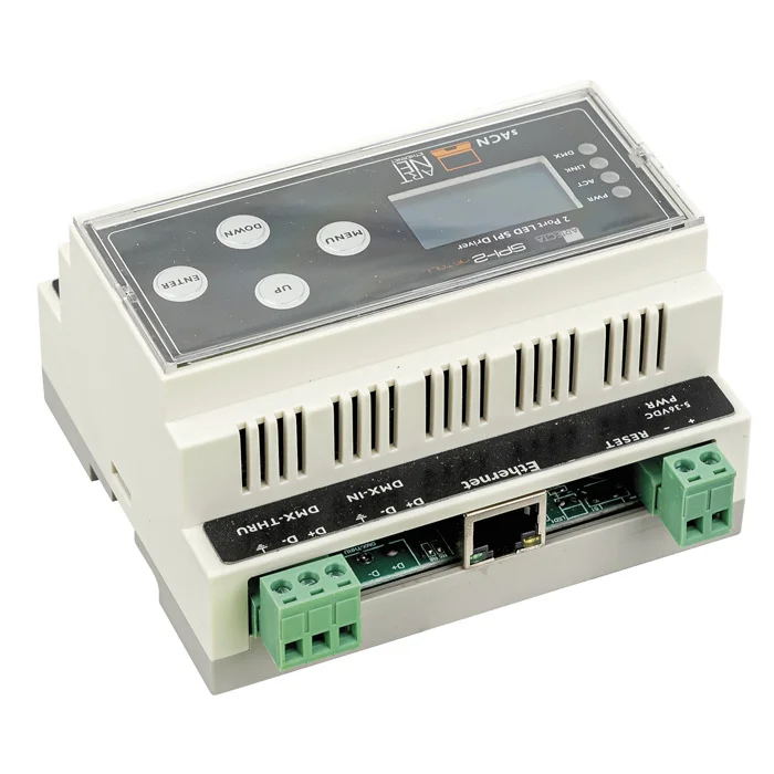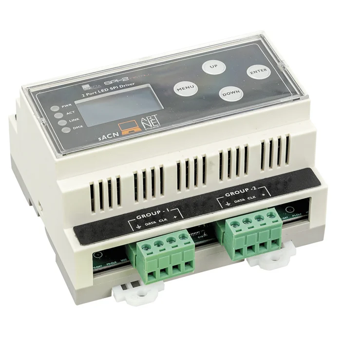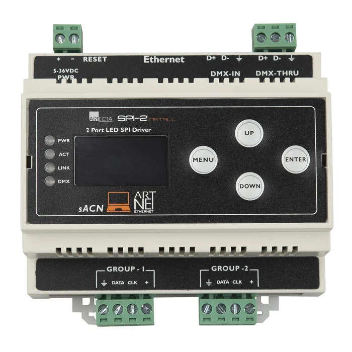 De Showtec SPI-2 Install is een compacte SPI-controller voor uw digitale LED-strips. De DIN-rail behuizing is ideaal voor vaste installaties. Alle aansluitingen zijn eenvoudig aan te sluiten met plug-in Phoenix klemmen. Gebruik gewoon DMX, Art-Net of sACN voor het aansturen van de meest gangbare types LEDs (WS2811, WS2812B, PSK6812, P943, UCS9812). Alle instellingen kunnen worden gedaan via het gebruiksvriendelijke menu op het grafische display en de knoppen aan de voorzijde of via de externe webinterface die binnen het netwerk toegankelijk is. Elke groepsuitgang kan tot 960 pixels aan. De op de DIN-rail gemonteerde SPI-2 converteert DMX, Art-Net of sACN naar SPI en is ideaal voor netwerksysteemintegratieprojecten.