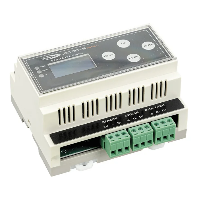 De Showtec LED Dim-8 Install is de ideale compacte PWM-dimmer voor vaste installaties. Alle aansluitingen zijn eenvoudig aan te sluiten met de insteekbare Phoenix-terminals. De LED Dim-8 Install is zeer gebruiksvriendelijk en universeel te configureren voor diverse LED strips. Het kan 12V tot 24V constante spanningsstrips aansturen via DMX of gebruikt worden als stand-alone controller voor een enkele scène en chases. De gebruikersinterface is zeer gebruiksvriendelijk door de hoge kwaliteit van het O-LED-display. Het kan maximaal 8A single channel stroom en 25A maximale totale stroom verwerken. De din-rail gemonteerde LED Dim-8 bestuurt uw RGBW-strips en is ideaal voor netwerksysteemintegratieprojecten.