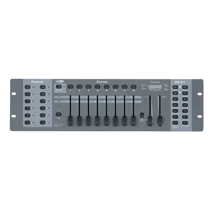 De SM-8/2 is een ideale instapregelaar voor gebruik met intelligente fixtures tot 16 kanalen. Het heeft 8 faders die 16 kanalen op 2 pagina's kunnen aansturen. Tot 12 fixtures kunnen worden geselecteerd en geprogrammeerd. Elk kanaal kan worden gepatcht op elke fader en het kan 250 scènes en 6 chases programmeren.