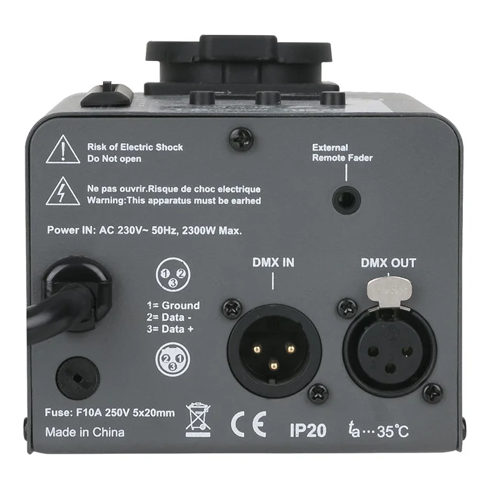 Technische specificaties Control mode: DMX / Manual DMX kanalen: 1 Draadloos: Wireless DMX Ingangssvoltage: 240 V AC 50-60 Hz Uitgangsvermogen per kanaal: 10 A Power connector in: Schuko Plug Power connector uit: Schuko Socket DMX connector in: XLR 3P DMX connector uit: XLR 3P Kabel lengte: 1 m Lengte (mm): 100 mm Breedte (mm): 95 mm Hoogte (mm): 273 mm Gewicht: 1.4 kg IP waarde: IP20 (indoor use only) Behuizing: Metal Kleur: Gray