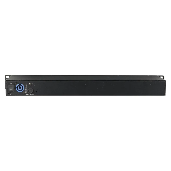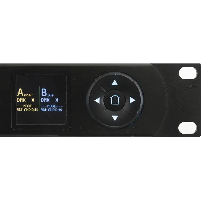 Technische specificaties Ingangssvoltage: 100-240 VAC 50-60 Hz Vermogensverbruik: 5 W Power connector in: Power Pro Blue DMX connector: XLR 5P In/Out DMX connector in: XLR 5P DMX connector uit: XLR 5P Lengte (mm): 483 mm Breedte (mm): 137 mm Hoogte (mm): 46 mm Gewicht: 2 kg Hoogte eenheden: 1 U IP waarde: IP20 (indoor use only) Behuizing: Metal / Plastic Kleur: Black Control mode: DMX Protocollen: DMX / RDM / USITT Scherm: OLED Universes: 2