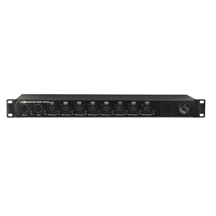 De Booster Pro is het ultieme DMX-gereedschap en perfect voor elk verhuurbedrijf of en elke installatie. De Booster Pro is een optisch geïsoleerde DMX-splitter en -booster. De Booster Pro heeft 2 inputs die kunnen worden gepatched naar 8 selecteerbare outputs. Naar elke output kunt u input A of B patchen. De Booster Pro is volledig compatible met RDM en biedt DMX-monitoring in real time. Voor gespecialiseerde toepassingen kan de DMX-timing worden aangepast. Bovendien heeft elke output van de Booster Pro een monitoringfunctie, die de status van de aangesloten kabels in real time bewaakt. In geval van een storing wordt de gebruiker gewaarschuwd met een geluidssignaal. Met behulp van het intuïtive oled-display stelt u alle functies snel en eenvoudig in.