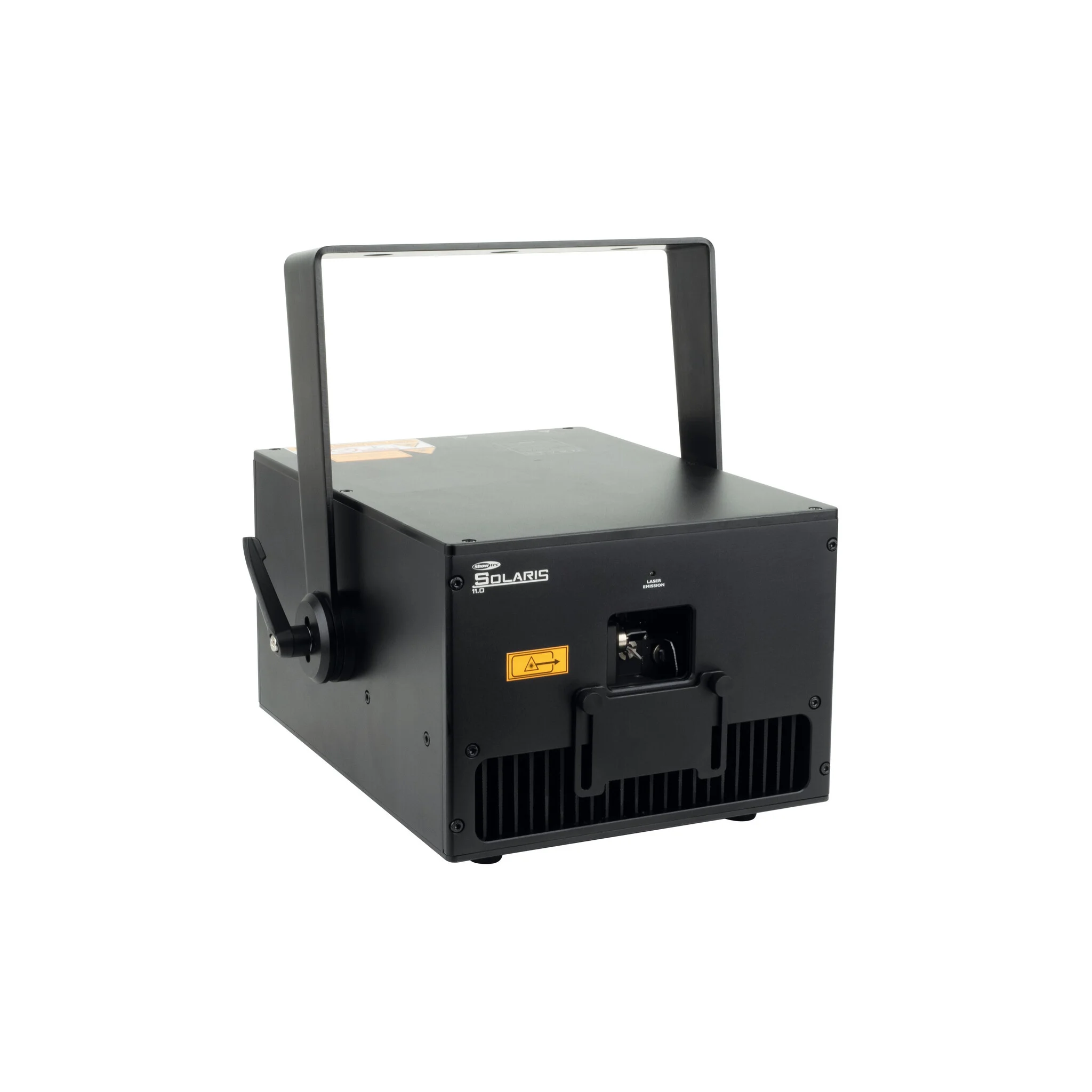 De Solaris 5.5 is een zeer krachtige 5.500mW RGB-laserprojector met ingebouwde Pangolin FB4 controlemodule, bedoeld voor gebruik in grote zalen. De FB4-module deblokkeert de bekroonde QuickShow-software, wat betekent dat je deze professionele software volledig gratis kunt gebruiken. Dit biedt uitgebreide mogelijkheden voor een professionele lasershowbesturing. Zo kun je je lasershows aansturen via een volledige netwerkopstelling, aangestuurd door de QuickShow software op je PC. Bovendien kun je hem ook bedienen via je lichtconsole via Art-Net of ILDA, en beschikt hij over een SD-kaartinterface voor het opslaan van automatische, stand-alone playbacks. Door gebruik te maken van lineaire analoge dimming modulatie, kan de Solaris 5.5 het volledige spectrum aan kleuren genereren. De zeer nauwkeurige en hoogwaardige constructie zorgt voor een perfecte afstemming van de RGB-bundels en vervormingsvrije beelden. De brede bundelhoek van 45° maakt grote projectiegebieden mogelijk. Hij is voorzien van alle nodige veiligheidsmaatregelen, zoals een overbelastingsbeveiliging voor het scansysteem, een vergrendelingssysteem met sleutel, een scan-fail beveiliging, een afdekplaat voor het diafragma, een noodstopsysteem en een afstandsbediening met sleutel.