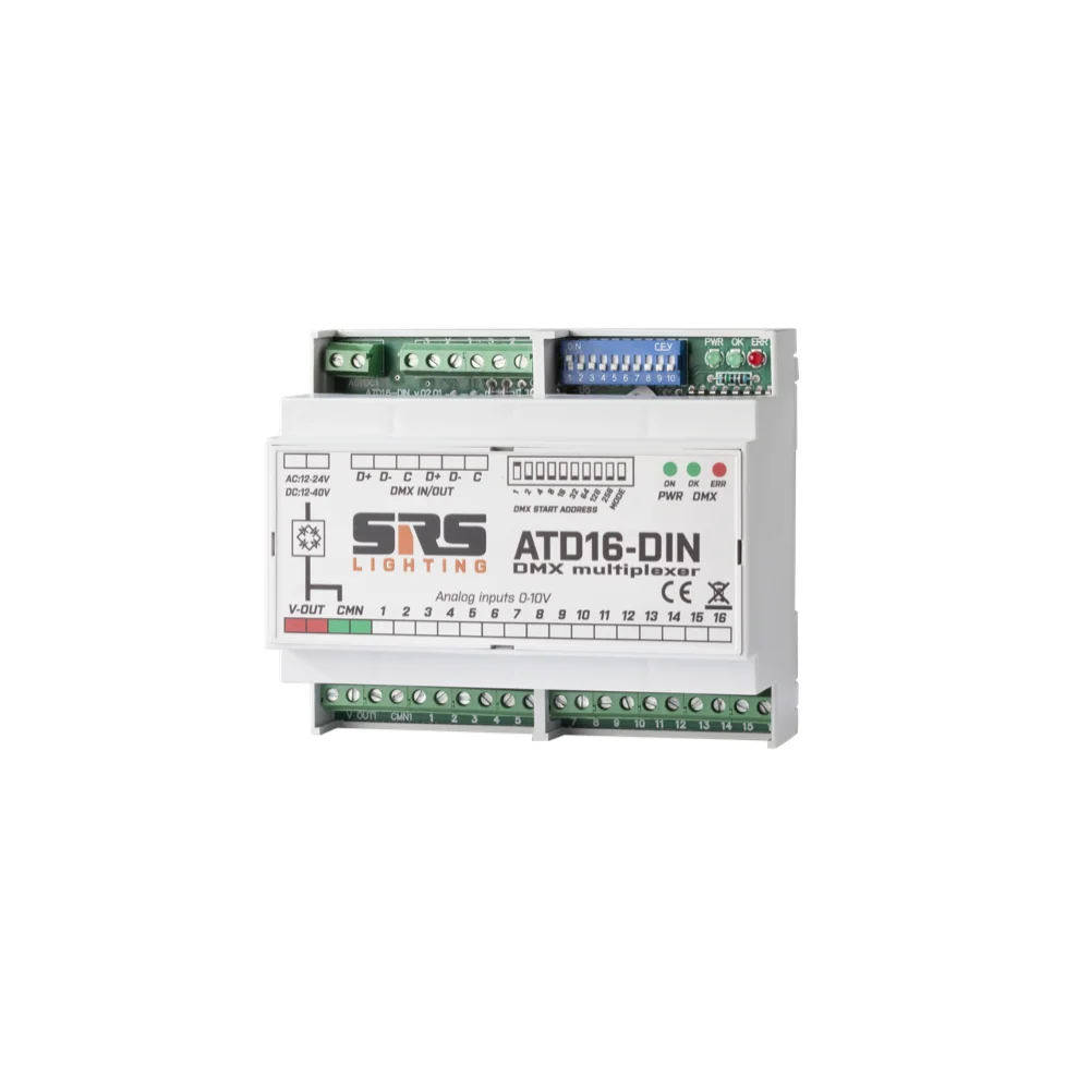De SRS Lighting ATD16-DIN is een veelzijdige 16-kanaals multiplexer/converter waarmee analoge 0/+10V signalen worden omgezet in het DMX-dataframe met variabele startadressen. Deze DIN-rail gemonteerde converter is ideaal voor toepassingen waarbij DMX-apparatuur moet worden aangestuurd door 0/+10V besturingssignalen afkomstig van de EIB/KNX-gateway of andere bronnen.