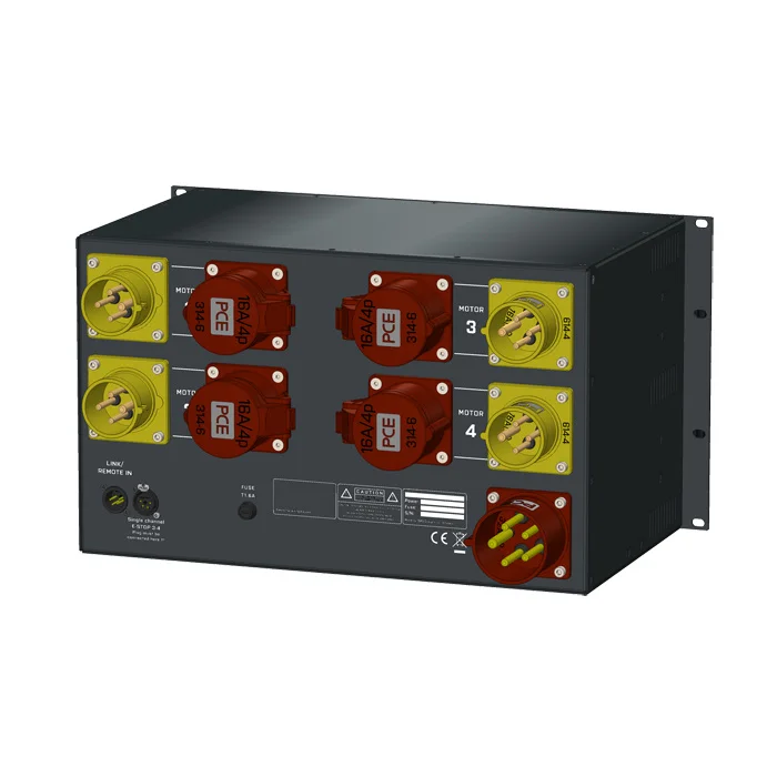 Type sturing: Low Voltage (LV), Aantal kanalen: 4-kanaals, Input: 1x CEE32A/5p, Output: 4x CEE16A/4p rood + 4x CEE16A/4p geel